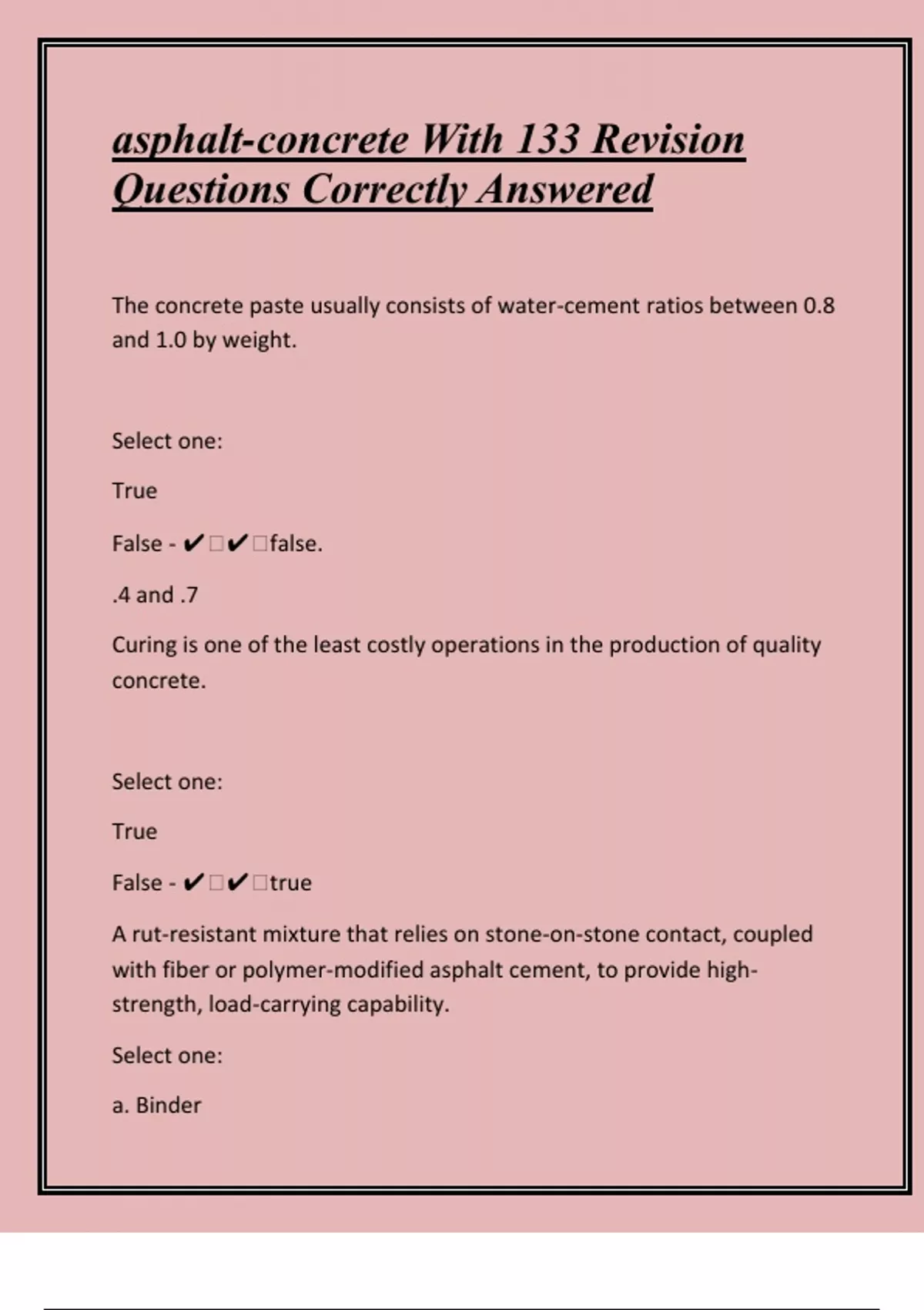 The concrete paste usually consists of water-cement ratios between 0.8 and 1.0 by weight. Select one: True False - false. .4 and .7 Curing is one of the least costly operations in the production of quality concrete. Select one: True False - true A rut-resistant mixture that relies on stone-on-stone contact, coupled with fiber or polymer-modified asphalt cement, to provide highstrength, load-carrying capability. Select one: a. Binderb. Stone matrix asphalt (SMA) c. Windrow d. Flexible Pavement - stone matrix asphalt