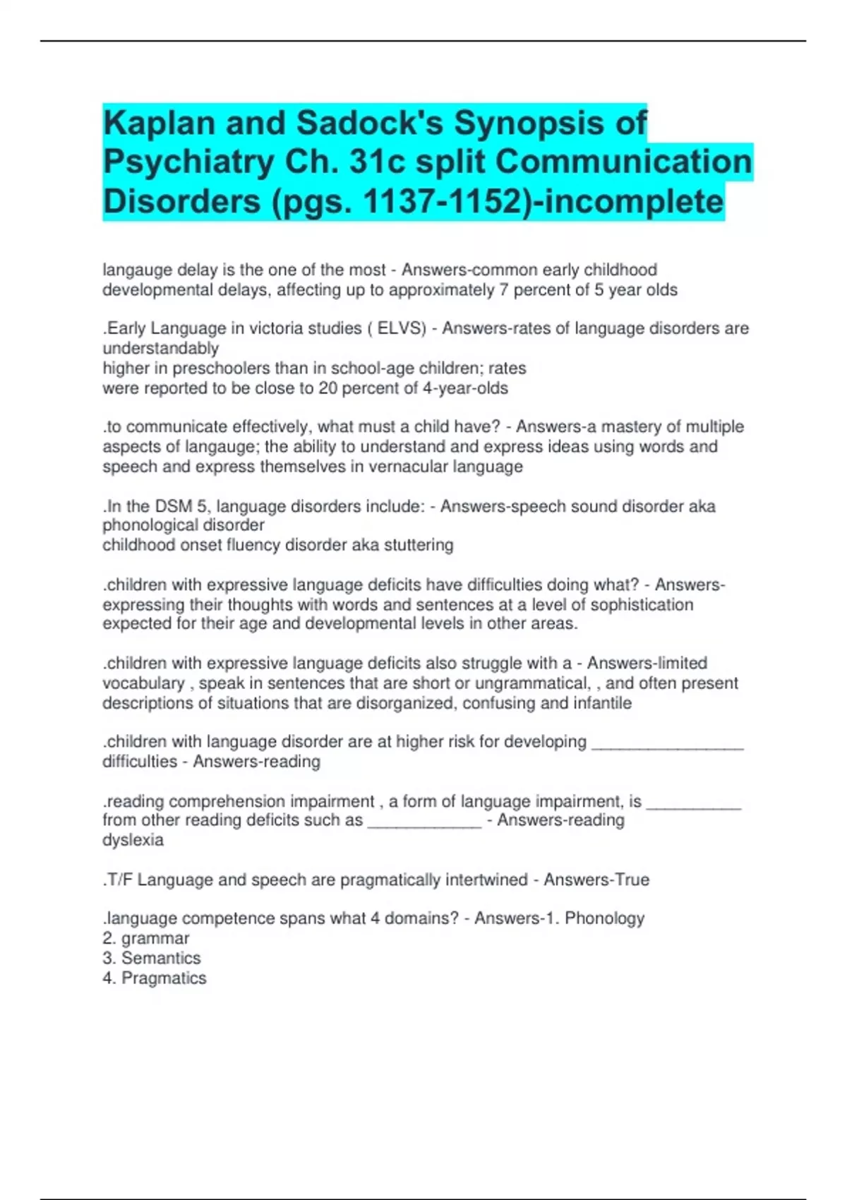 Kaplan and Sadock's Synopsis of Psychiatry Ch. 31c split Communication Disorders (pgs. )-incomplete langauge delay is the one of the most - Answers-common early childhood developmental delays, affecting up to approximately 7 percent of 5 year olds .Early Language in victoria studies ( ELVS) - Answers-rates of language disorders are understandably higher in preschoolers than in school-age children; rates were reported to be close to 20 percent of 4-year-olds .to communicate effectively, what must a child have? - Answers-a mastery of multiple aspects of langauge; the ability to understand and express ideas using words and speech and express themselves in vernacular language .In the DSM 5, language disorders include: - Answers-speech sound disorder aka phonological disorder childhood onset fluency disorder aka stuttering .children with expressive language deficits have difficulties doing what? - Answers-expressing their thoughts with words and sentences at a level of sophistication expected for their age and developmental levels in other areas. .children with expressive language deficits also struggle with a - Answers-limited vocabulary , speak in sentences that are short or ungrammatical, , and often present descriptions of situations that are disorganized, confusing and infantile .children with language disorder are at higher risk for developing ________________ difficulties - Answers-reading .reading comprehension impairment , a form of language impairment, is __________ from other reading deficits such as ____________ - Answers-reading dyslexia .T/F Language and speech are pragmatically intertwined - Answers-True .language competence spans what 4 domains? - Answers-1. Phonology 2. grammar 3. Semantics 4. Pragmatics