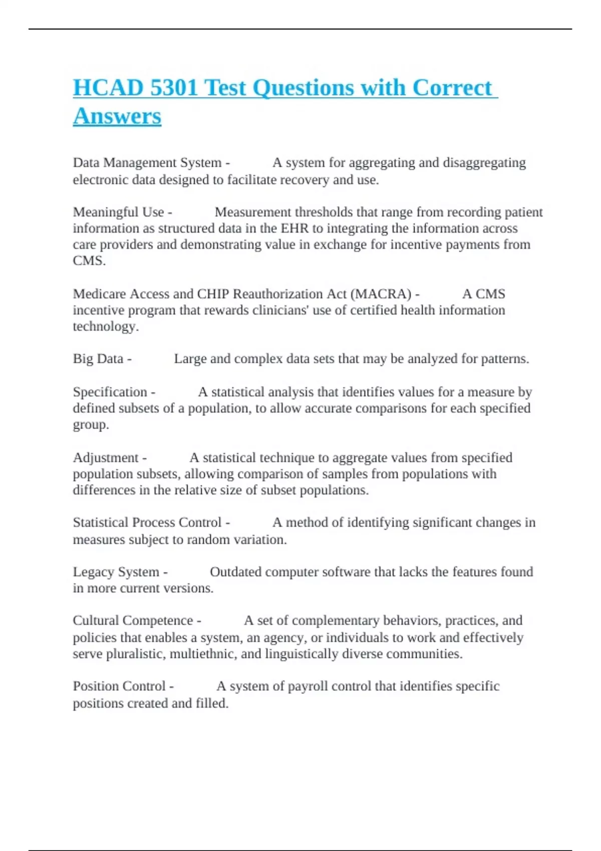 Data Management System - A system for aggregating and disaggregating electronic data designed to facilitate recovery and use. Meaningful Use - Measurement thresholds that range from recording patient information as structured data in the EHR to integrating the information across care providers and demonstrating value in exchange for incentive payments from CMS. Medicare Access and CHIP Reauthorization Act (MACRA) - A CMS incentive program that rewards clinicians' use of certified health information technology. Big Data - Large and complex data sets that may be analyzed for patterns. Specification - A statistical analysis that identifies values for a measure by defined subsets of a population, to allow accurate comparisons for each specified group. Adjustment - A statistical technique to aggregate values from specified population subsets, allowing comparison of samples from populations with differences in the relative size of subset populations. Statistical Process Control - A method of identifying significant changes in measures subject to random variation. Legacy System - Outdated computer software that lacks the features found in more current versions. Cultural Competence - A set of complementary behaviors, practices, and policies that enables a system, an agency, or individuals to work and effectively serve pluralistic, multiethnic, and linguistically diverse communities. Position Control - A system of payroll control that identifies specific positions created and filled.