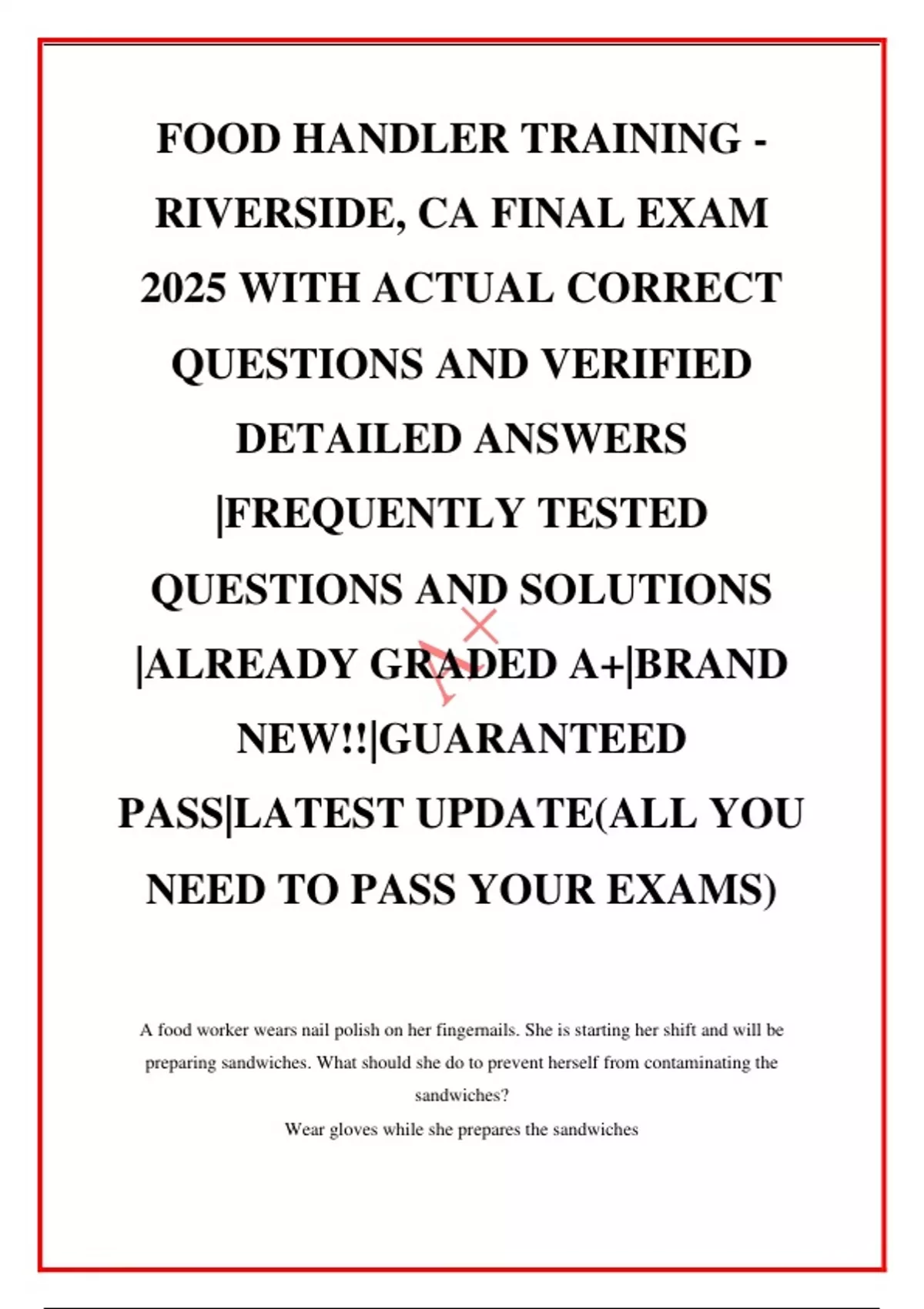 FOOD HANDLER TRAINING - RIVERSIDE, CA FINAL EXAM 2025 WITH ACTUAL CORRECT QUESTIONS AND VERIFIED DETAILED ANSWERS |FREQUENTLY TESTED QUESTIONS AND SOLUTIONS |ALREADY GRADED A+|BRAND NEW!!|GUARANTEED PASS|LATEST UPDATE(ALL YOU NEED TO PASS YOUR EXAMS)