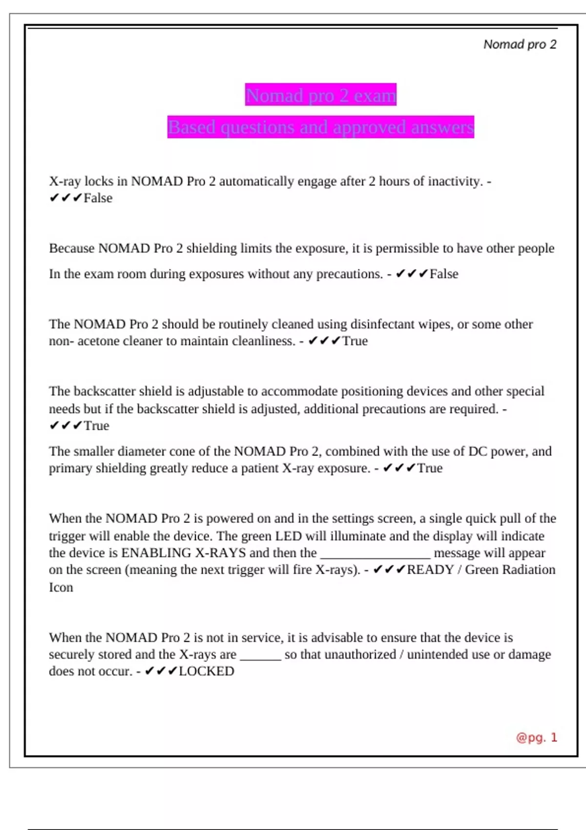 X-ray locks in NOMAD Pro 2 automatically engage after 2 hours of inactivity. - False Because NOMAD Pro 2 shielding limits the exposure, it is permissible to have other people In the exam room during exposures without any precautions. - False The NOMAD Pro 2 should be routinely cleaned using disinfectant wipes, or some other non- acetone cleaner to maintain cleanliness. - True The backscatter shield is adjustable to accommodate positioning devices and other special needs but if the backscatter shield is adjusted, additional precautions are required. - True The smaller diameter cone of the NOMAD Pro 2, combined with the use of DC power, and primary shielding greatly reduce a patient X-ray exposure. - True When the NOMAD Pro 2 is powered on and in the settings screen, a single quick pull of the trigger will enable the device. The green LED will illuminate and the display will indicate the device is ENABLING X-RAYS and then the ________________ message will appear on the screen (meaning the next trigger will fire X-rays). - READY / Green Radiation Icon When the NOMAD Pro 2 is not in service, it is advisable to ensure that the device is securely stored and the X-rays are ______ so that unauthorized / unintended use or damage does not occur. - LOCKED