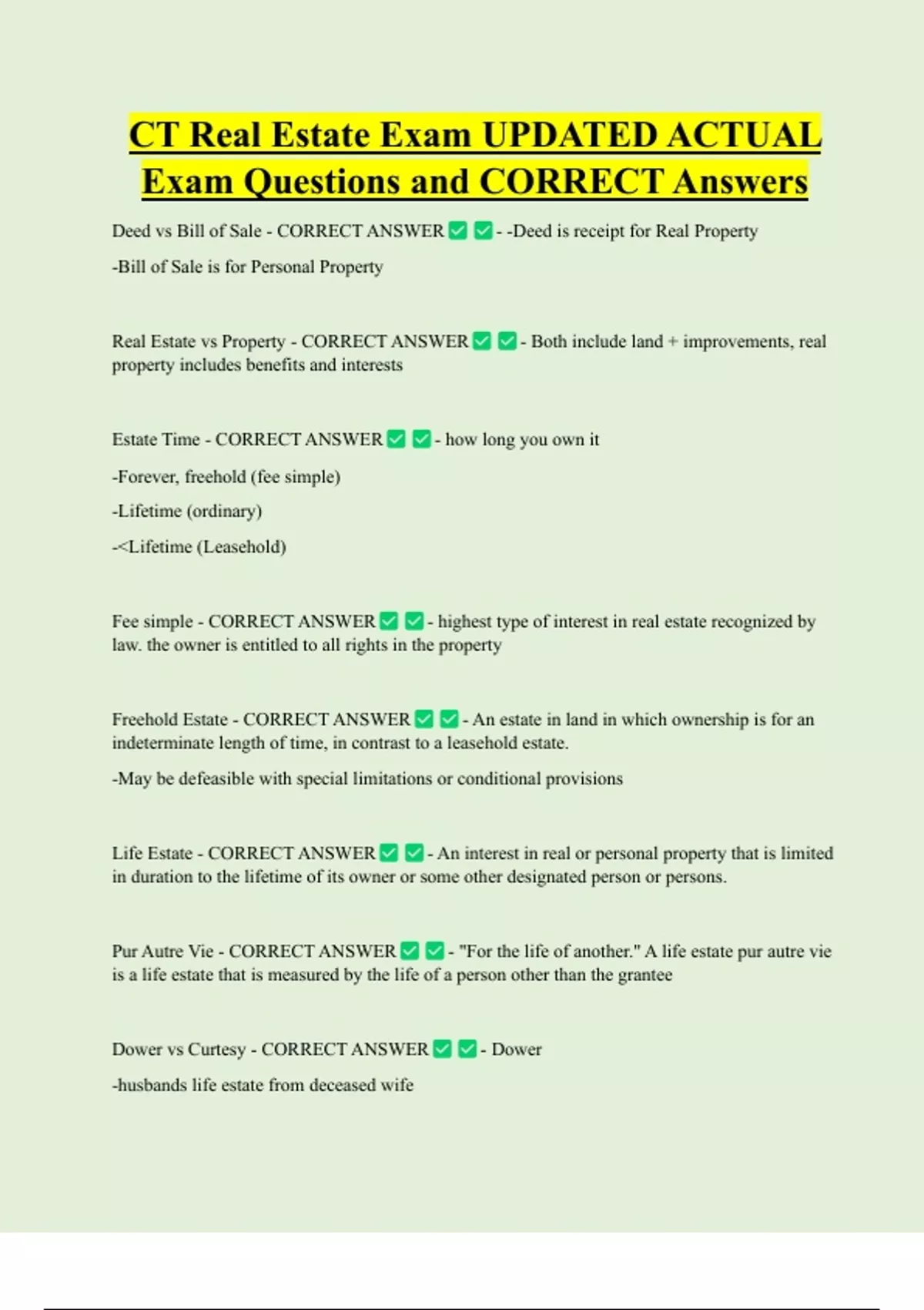 CT Real Estate Exam UPDATED ACTUAL Exam Questions and CORRECT Answers Deed vs Bill of Sale - CORRECT ANSWER - -Deed is receipt for Real Property -Bill of Sale is for Personal Property Real Estate vs Property - CORRECT ANSWER - Both include land + improvements, real property includes benefits and interes