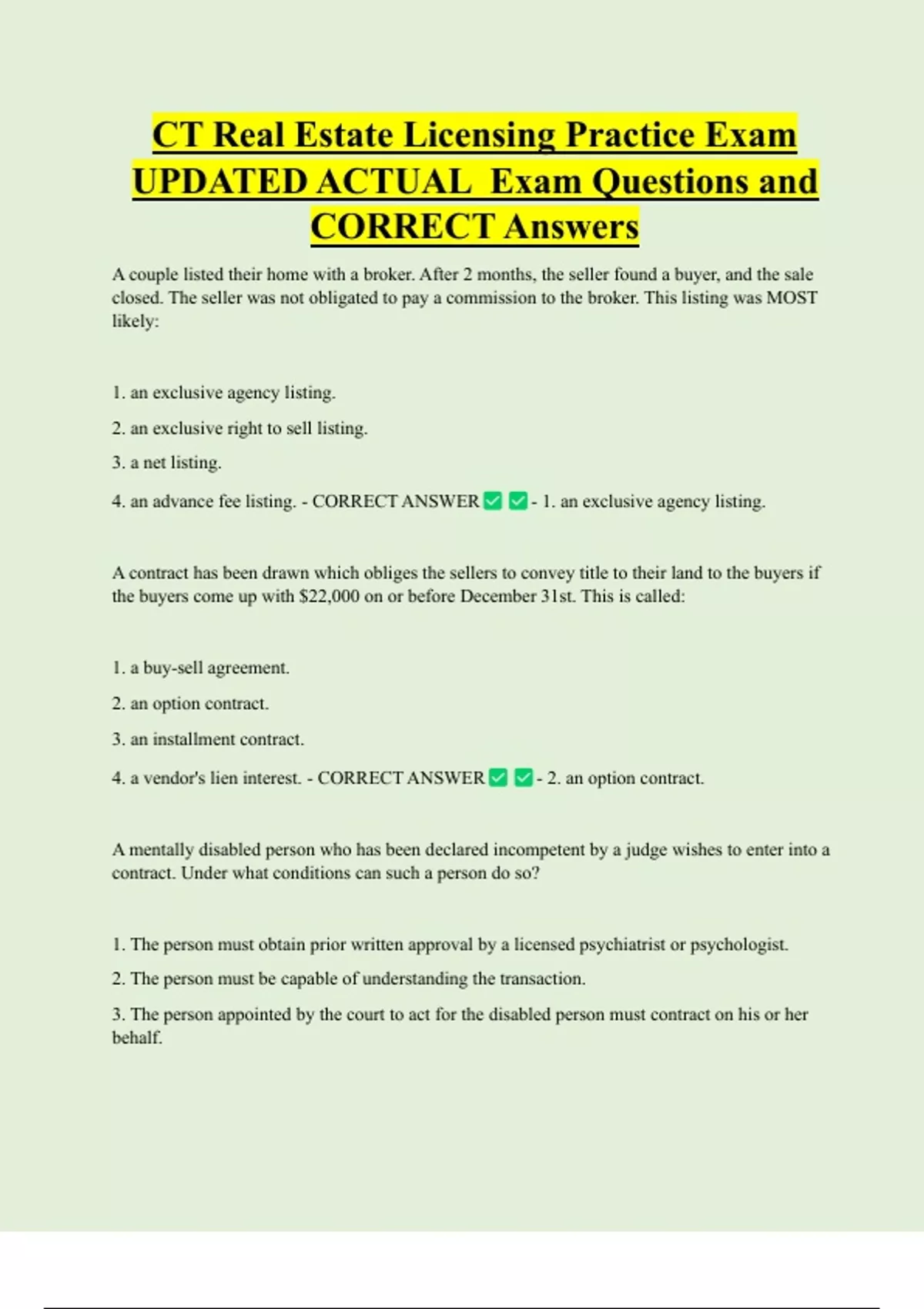 CT Real Estate Licensing Practice Exam UPDATED ACTUAL Exam Questions and CORRECT Answers
