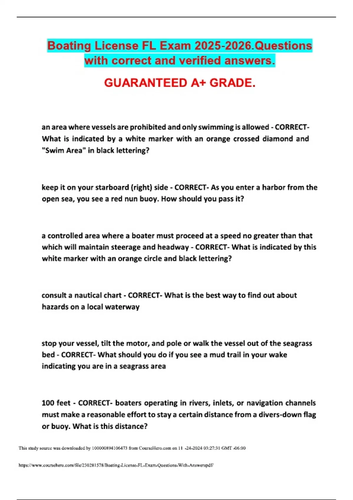 Boating License FL Exam .Questions with correct and verified answers. GUARANTEED A+ GRADE. an area where vessels are prohibited and only swimming is allowed - CORRECT- What is indicated by a white marker with an orange crossed diamond and "Swim Area" in black lettering? keep it on your starboard (right) side - CORRECT- As you enter a harbor from the open sea, you see a red nun buoy. How should you pass it? a controlled area where a boater must proceed at a speed no greater than that which will maintain steerage and headway - CORRECT- What is indicated by this white marker with an orange circle and black lettering? consult a nautical chart - CORRECT- What is the best way to find out about hazards on a local waterway stop your vessel, tilt the motor, and pole or walk the vessel out of the seagrass bed - CORRECT- What should you do if you see a mud trail in your wake indicating you are in a seagrass area 100 feet - CORRECT- boaters operating in rivers, inlets, or navigation channels must make a reasonable effort to stay a certain distance from a divers-down flag or buoy. What is this distance? conduct an emergency drill with the passengers - CORRECT- What should a vessel operator to do make sure everyone knows what to do in case of an emergency?