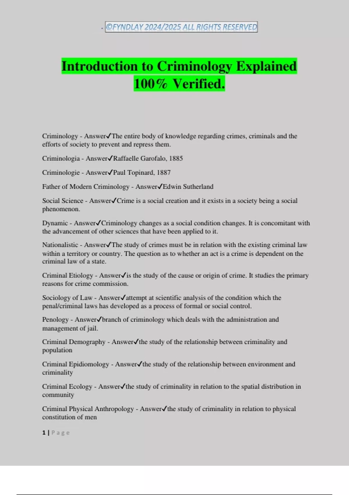 Criminologia - Answer✔Raffaelle Garofalo, 1885