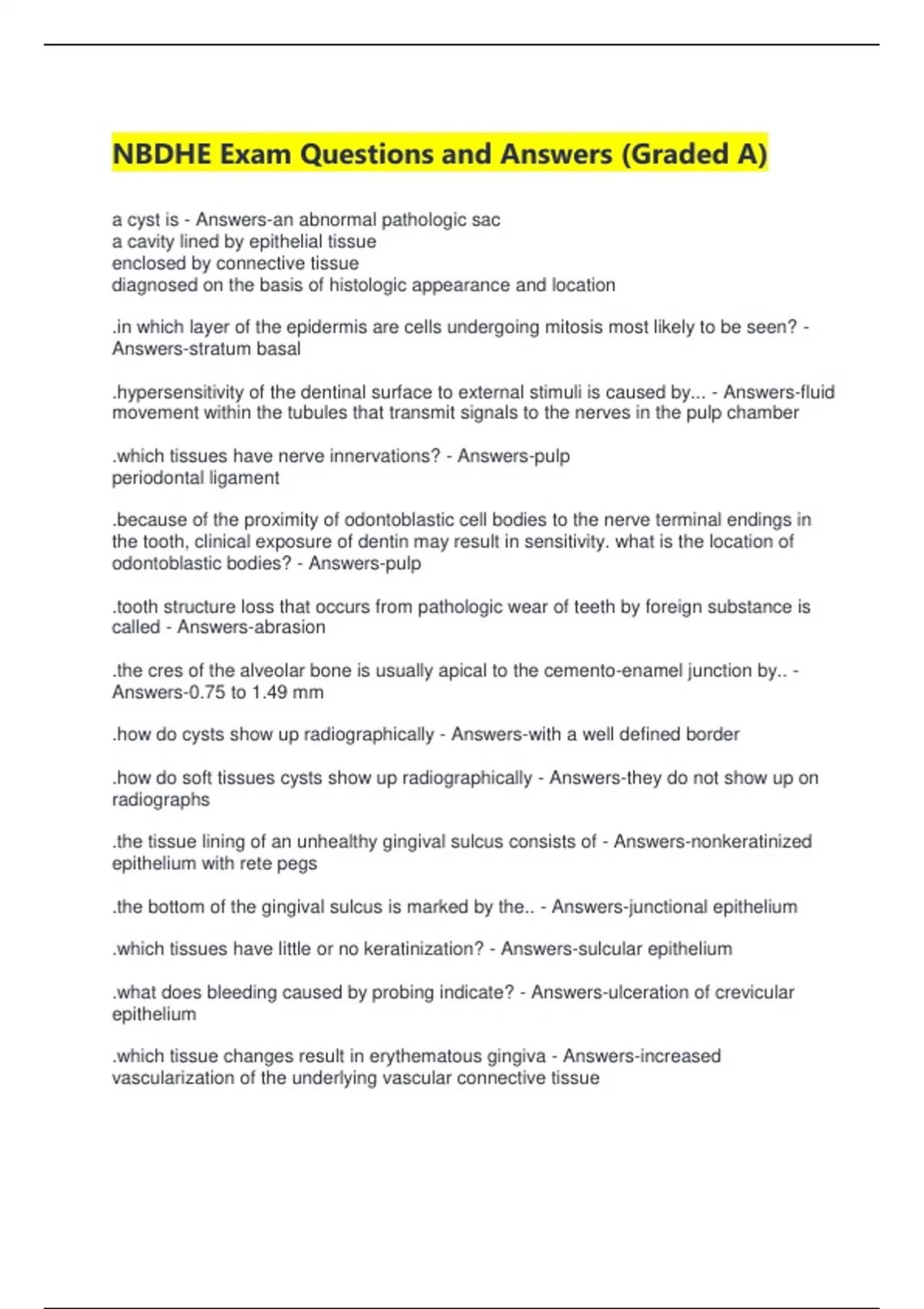 NBDHE Exam Questions and Answers (Graded A) a cyst is - Answers-an abnormal pathologic sac a cavity lined by epithelial tissue enclosed by connective tissue diagnosed on the basis of histologic appearance and location .in which layer of the epidermis are cells undergoing mitosis most likely to be seen? - Answers-stratum basal .hypersensitivity of the dentinal surface to external stimuli is caused by... - Answers-fluid movement within the tubules that transmit signals to the nerves in the pulp chamber .which tissues have nerve innervations? - Answers-pulp periodontal ligament .because of the proximity of odontoblastic cell bodies to the nerve terminal endings in the tooth, clinical exposure of dentin may result in sensitivity. what is the location of odontoblastic bodies? - Answers-pulp .tooth structure loss that occurs from pathologic wear of teeth by foreign substance is called - Answers-abrasion .the cres of the alveolar bone is usually apical to the cemento-enamel junction by.. - Answers-0.75 to 1.49 mm .how do cysts show up radiographically - Answers-with a well defined border .how do soft tissues cysts show up radiographically - Answers-they do not show up on radiographs .the tissue lining of an unhealthy gingival sulcus consists of - Answers-nonkeratinized epithelium with rete pegs .the bottom of the gingival sulcus is marked by the.. - Answers-junctional epithelium .which tissues have little or no keratinization? - Answers-sulcular epithelium .what does bleeding caused by probing indicate? - Answers-ulceration of crevicular epithelium .which tissue changes result in erythematous gingiva - Answers-increased vascularization of the underlying vascular connective tissue .what type of connective tissue underlies the epithelium of the gingival? - Answers-fibrous which gives it its firm consistency .in gingivitis, poor tissue tone is caused by - Answers-destruction of collagen fibers .definitive diagnosis of furcation involvement is made by - Answers-clinical probing because it cant always be seen in radiographs .enamel projections of the root surface are attributed to the differentiation of - Answers-hertwig's epithelial root sheath .hertwig's epithelial root sheath is derived from the - Answers-reduced enamel epithelium .hertwing's epithelial root sheath is entirely composed of - Answers-inner and outer enamel epithelium .when is root formation completed? - Answers-1-4 years after eruption .remnants of hertwig's epithelial root sheath found in the periodontal ligament of a functioning tooth are called - Answers-rests of malassez .the stippled texture of gingiva may be attributed to - Answers-connective tissue projections .the color of gingiva may be attributed to - Answers-keratinization thickness of the epithelium blood supply pigmentation .a specialized periosteum which forms and resorbs bone and cementum is called - Answers-periodontal ligament .what is the outer less calcified layer of cementum that results in cementum resorbing less readily than bone ? - Answers-cementoid .cementum is a product of - Answers-periodontal ligament .which cells does the periodontal ligament contain? - Answers-osteoblasts osteoclasts cementoblasts cementoclasts .a cleft-like absence of the alveolar cortical plate resulting in a denuded root surface is called - Answers-dehiscence .characteristics of bundle bone (alveolar bone proper) - Answers-adjacent to the periodontal ligament and containing sharpey's fibers .which tissues of the normal periodontium is the alveolar bone directly adjacent to? - Answers-periodontal ligament and gingival connective tissue .the cells that are important in the formation of the principal fibers of the periodontal ligament are - Answers-fibroblasts .the types of epithelia found lining the oral cavity include - Answers-keratinized and nonkeratinized stratified squamous .epithelial tissues are characterized by - Answers-little intercellular substance and many cells .embryonically, the mandible is derived from the - Answers-first branchial arch .the anterior portion, or body, of the tongue develops from the - Answers-mandibular process .a cleft lip occurs when the maxillary process fails to fuse with the - Answers-globular process .one of the first structures of the face to develop in the primitive embryo is the - Answers-stomodeum .the lateral palatine processes initially grow downward toward the future floor of the mouth. this is caused by the presence of the - Answers-tongue .when a cleft of the alveolar process is present, it occurs between the - Answers-lateral incisor and canine .the cementum is derived from the - Answers-dental sac .during embryonic development, neural crest cells migrate to the branchial arches and surround the - Answers-mesoderm .enamel is derived from the - Answers-ectoderm .dental papilla is part of the.. - Answers-tooth germ that forms dentin and pulp .the periodontal ligament is derived from the - Answers-dental sac .dentin is the product of the - Answers-dental papilla .in what phase is a cell highly active and growing - Answers-interphase