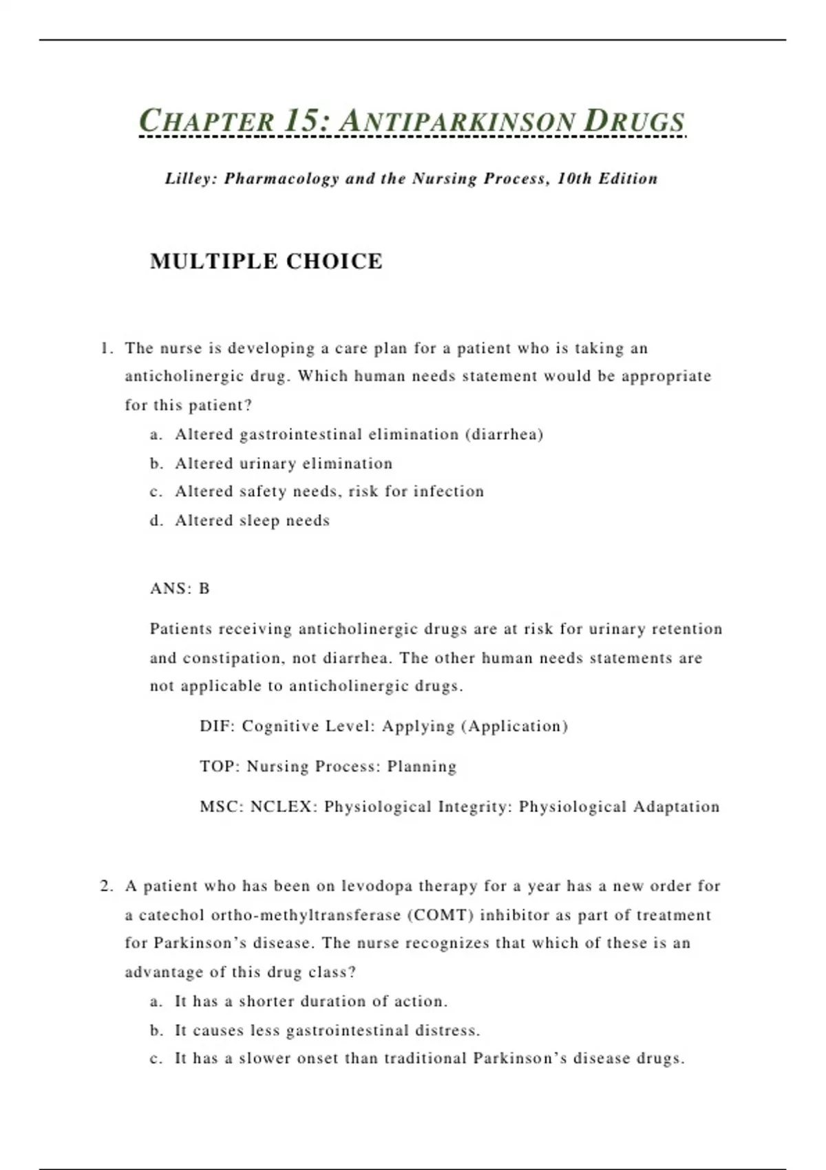 2. A patient who has been on levodopa therapy for a year has a new order for