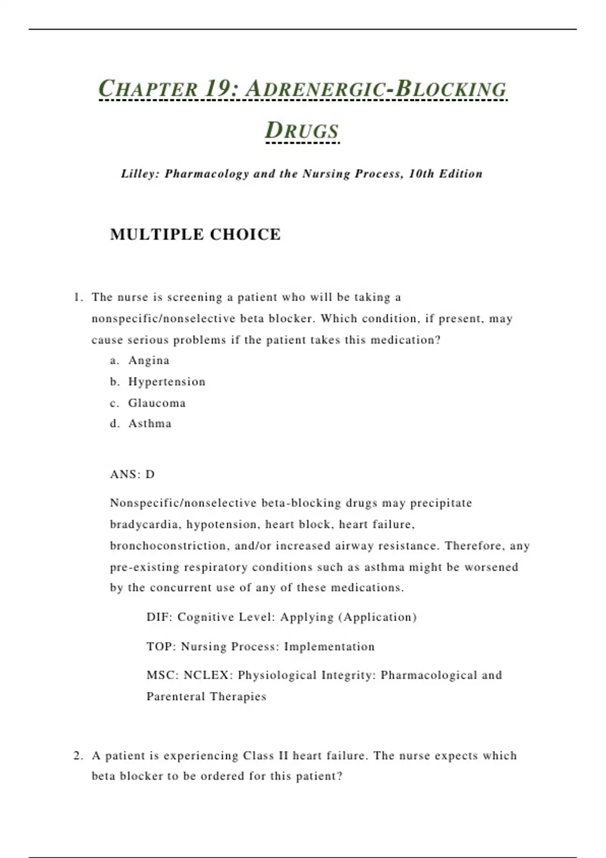 Lilley: Pharmacology and the Nursing Process, 10th Edition MULTIPLE CHOICE 1. The nurse is screening a patient who will be taking a nonspecific/nonselective beta blocker. Which condition, if present, may cause serious problems if the patient takes this medication? a. Angina b. Hypertension c. Glaucoma d. Asthma ANS: D Nonspecific/nonselective beta-blocking drugs may precipitate bradycardia, hypotension, heart block, heart failure, bronchoconstriction, and/or increased airway resistance. Therefore, any pre-existing respiratory conditions such as asthma might be worsened by the concurrent use of any of these medications. DIF: Cognitive Level: Applying (Application) TOP: Nursing Process: Implementation MSC: NCLEX: Physiological Integrity: Pharmacological and Parenteral Therapies 2. A patient is experiencing Class II heart failure. The nurse expects which beta blocker to be ordered for this patient? a. Atenolol b. Carvedilol c. Labetalol d. Esmolol ANS: B Not all beta blockers are used for the treatment of heart failure. Carvedilol is currently used in the treatment of heart failure. The other drugs listed are not indicated for the treatment of heart failure. DIF: Cognitive Level: Understanding (Comprehension) TOP: Nursing Process: Planning MSC: NCLEX: Physiological Integrity: Pharmacological and Parenteral Therapies 3. During a teaching session about self-monitoring while taking a beta blocker at home, the nurse has taught the patient to take his apical pulse daily for 1 minute. If the pulse rate decreases to less than 60 beats/min, the nurse will instruct the patient to do which of these? a. Notify his prescriber. b. Reduce the dose of his beta blocker by half. c. Continue the medication because this is an expected effect. d. Skip the medication dose that day, and check his pulse again the next day.