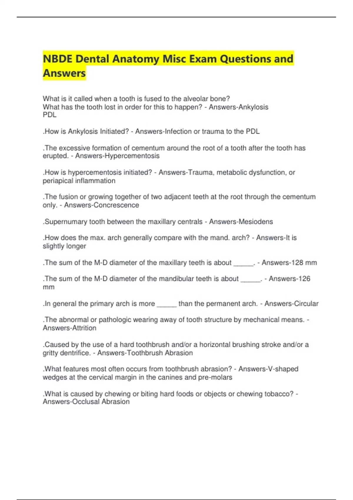 NBDE Dental Anatomy Misc Exam Questions and Answers What is it called when a tooth is fused to the alveolar bone? What has the tooth lost in order for this to happen? - Answers-Ankylosis PDL .How is Ankylosis Initiated? - Answers-Infection or trauma to the PDL .The excessive formation of cementum around the root of a tooth after the tooth has erupted. - Answers-Hypercementosis .How is hypercementosis initiated? - Answers-Trauma, metabolic dysfunction, or periapical inflammation .The fusion or growing together of two adjacent teeth at the root through the cementum only. - Answers-Concrescence .Supernumary tooth between the maxillary centrals - Answers-Mesiodens .How does the max. arch generally compare with the mand. arch? - Answers-It is slightly longer .The sum of the M-D diameter of the maxillary teeth is about _____. - Answers-128 mm .The sum of the M-D diameter of the mandibular teeth is about _____. - Answers-126 mm .In general the primary arch is more _____ than the permanent arch. - Answers-Circular .The abnormal or pathologic wearing away of tooth structure by mechanical means. - Answers-Attrition .Caused by the use of a hard toothbrush and/or a horizontal brushing stroke and/or a gritty dentrifice. - Answers-Toothbrush Abrasion .What features most often occurs from toothbrush abrasion? - Answers-V-shaped wedges at the cervical margin in the canines and pre-molars .What is caused by chewing or biting hard foods or objects or chewing tobacco? - Answers-Occlusal Abrasion