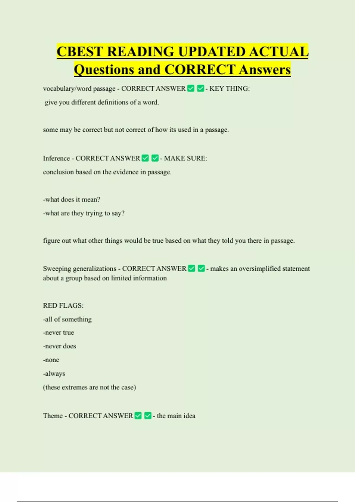 CBEST READING UPDATED ACTUAL Questions and CORRECT Answers vocabulary/word passage - CORRECT ANSWER - KEY THING: give you different definitions of a word. some may be correct but not correct of how its used in a passage. Inference - CORRECT ANSWER - MAKE SURE: conclusion based on the evidence in passag