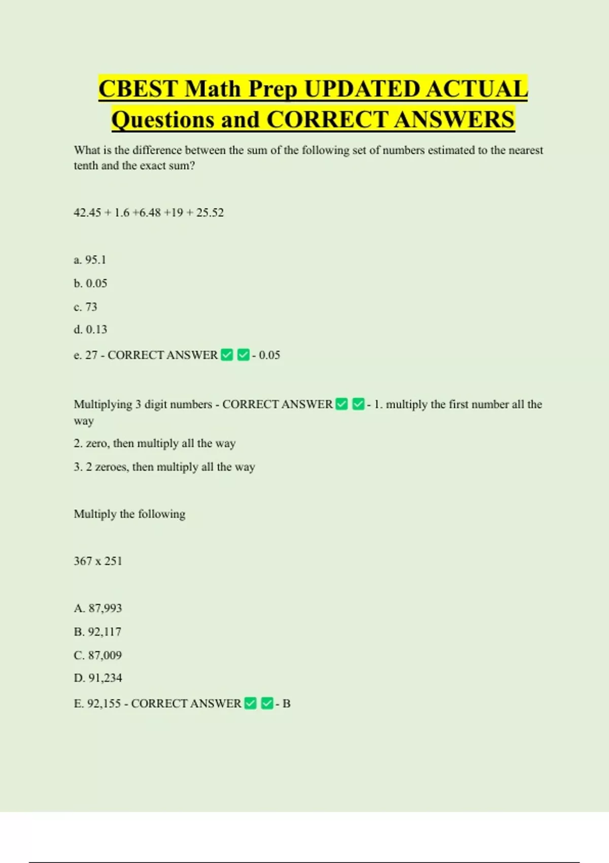 CBEST Math Prep UPDATED ACTUAL Questions and CORRECT ANSWERS What is the difference between the sum of the following set of numbers estimated to the nearest tenth and the exact sum? 42.45 + 1.6 +6.48 +19 + 25.52 a. 95.1 b. 0.05 c. 73 d. 0.13 e. 27 - CORRECT ANSWER - 0.05