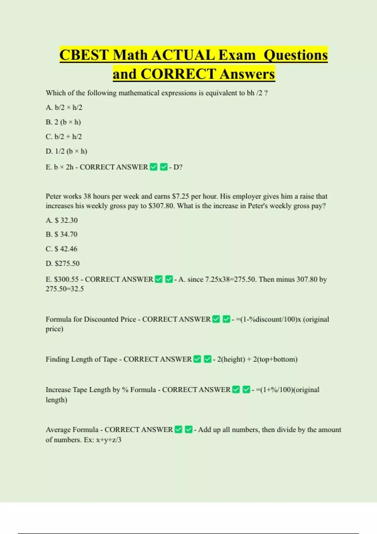 CBEST Math ACTUAL Exam Questions and CORRECT Answers Which of the following mathematical expressions is equivalent to bh /2 ? A. b/2 × h/2 B. 2 (b × h) C. b/2 + h/2 D. 1/2 (b × h) E. b × 2h - CORRECT ANSWER - D?