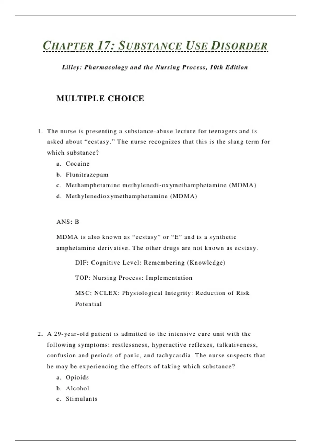 Lilley: Pharmacology and the Nursing Process, 10th Edition MULTIPLE CHOICE 1. The nurse is presenting a substance-abuse lecture for teenagers and is asked about “ecstasy.” The nurse recognizes that this is the slang term for which substance? a. Cocaine b. Flunitrazepam c. Methamphetamine methylenedi-oxymethamphetamine (MDMA) d. Methylenedioxymethamphetamine (MDMA) ANS: B MDMA is also known as “ecstasy” or “E” and is a synthetic amphetamine derivative. The other drugs are not known as ecstasy. DIF: Cognitive Level: Remembering (Knowledge) TOP: Nursing Process: Implementation MSC: NCLEX: Physiological Integrity: Reduction of Risk Potential 2. A 29-year-old patient is admitted to the intensive care unit with the following symptoms: restlessness, hyperactive reflexes, talkativeness, confusion and periods of panic, and tachycardia. The nurse suspects that he may be experiencing the effects of taking which substance? a. Opioids b. Alcohol c. Stimulants d. Depressants ANS: C The adverse effects listed may occur with use of stimulants and are commonly an extension of their therapeutic effects. Opioids, alcohol, and depressants do not have these effects. DIF: Cognitive Level: Applying (Application) TOP: Nursing Process: Assessment MSC: NCLEX: Physiological Integrity: Pharmacological and Parenteral Therapies 3. When admitting a patient with a suspected diagnosis of chronic alcohol use, the nurse will keep in mind that chronic use of alcohol might result in which condition? a. Renal failure b. Cerebrovascular accident c. Korsakoff’s psychosis d. Alzheimer’s disease