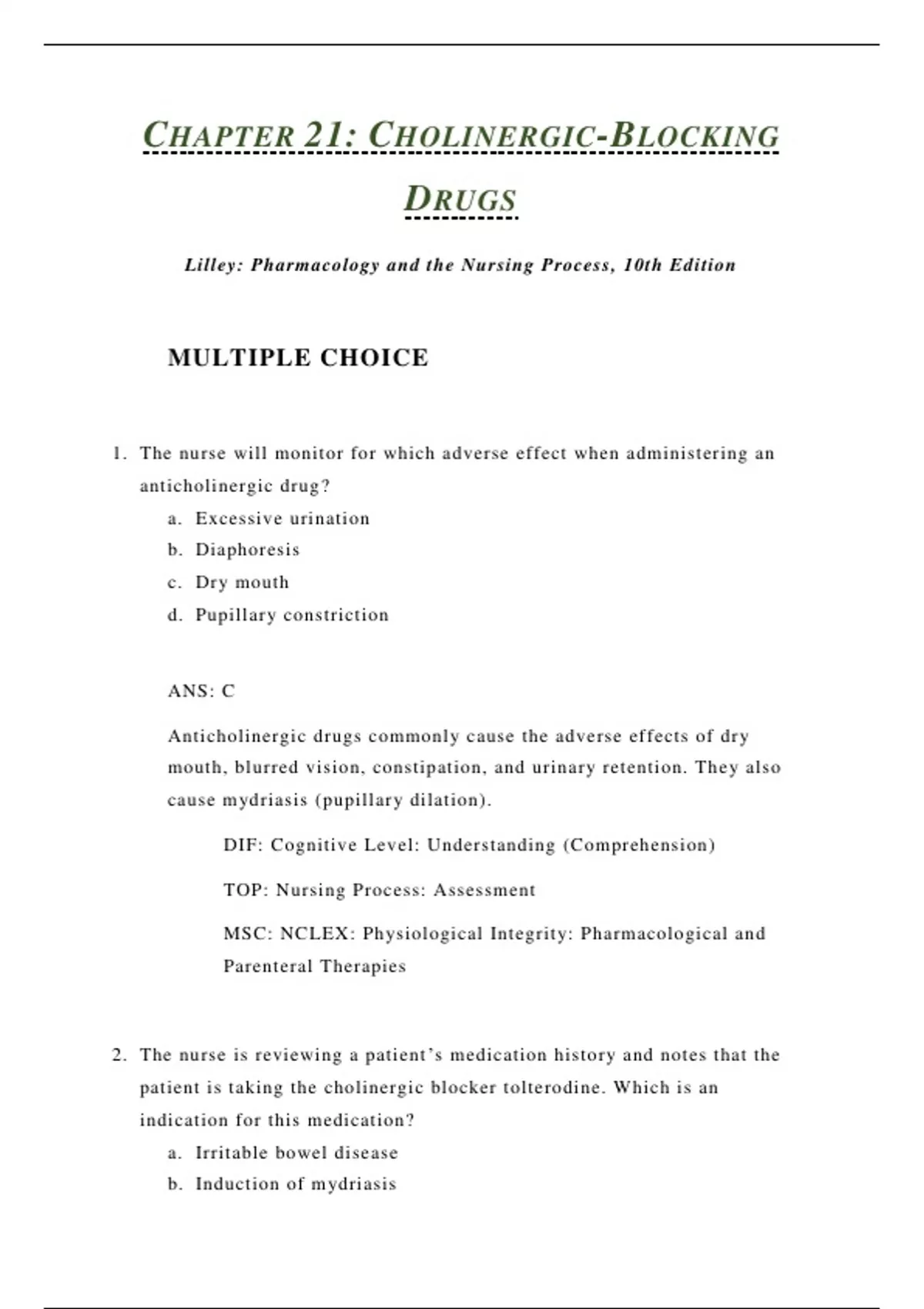 Lilley: Pharmacology and the Nursing Process, 10th Edition MULTIPLE CHOICE 1. The nurse will monitor for which adverse effect when administering an anticholinergic drug? a. Excessive urination b. Diaphoresis c. Dry mouth d. Pupillary constriction ANS: C Anticholinergic drugs commonly cause the adverse effects of dry mouth, blurred vision, constipation, and urinary retention. They also cause mydriasis (pupillary dilation). DIF: Cognitive Level: Understanding (Comprehension) TOP: Nursing Process: Assessment MSC: NCLEX: Physiological Integrity: Pharmacological and Parenteral Therapies 2. The nurse is reviewing a patient’s medication history and notes that the patient is taking the cholinergic blocker tolterodine. Which is an indication for this medication? a. Irritable bowel disease b. Induction of mydriasis c. Urge incontinence d. Reduction of secretions preoperatively ANS: C Tolterodine (Detrol) is used for urinary frequency, urgency, and urge incontinence caused by bladder (detrusor) overactivity. The conditions in the other options are not indications. DIF: Cognitive Level: Understanding (Comprehension) TOP: Nursing Process: Planning MSC: NCLEX: Physiological Integrity: Pharmacological and Parenteral Therapies 3. A patient has been taking tolterodine, but today her prescriber changed her to a newer drug, darifenacin. What advantage does darifenacin have over the tolterodine? a. The newer cholinergic-blocker drugs are more effective. b. It helps reduce urinary retention. c. It can be used in patients with narrow-angle glaucoma. d. The incidence of dry mouth is much lower with darifenacin.