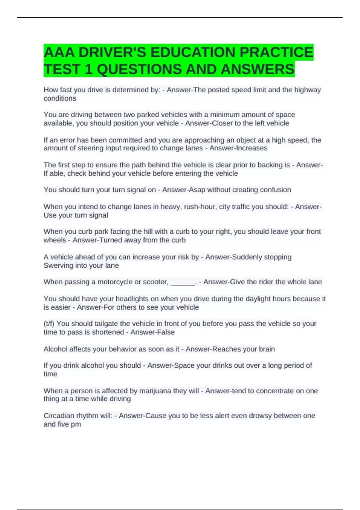 AAA DRIVER'S EDUCATION PRACTICE TEST 1 QUESTIONS AND ANSWERS