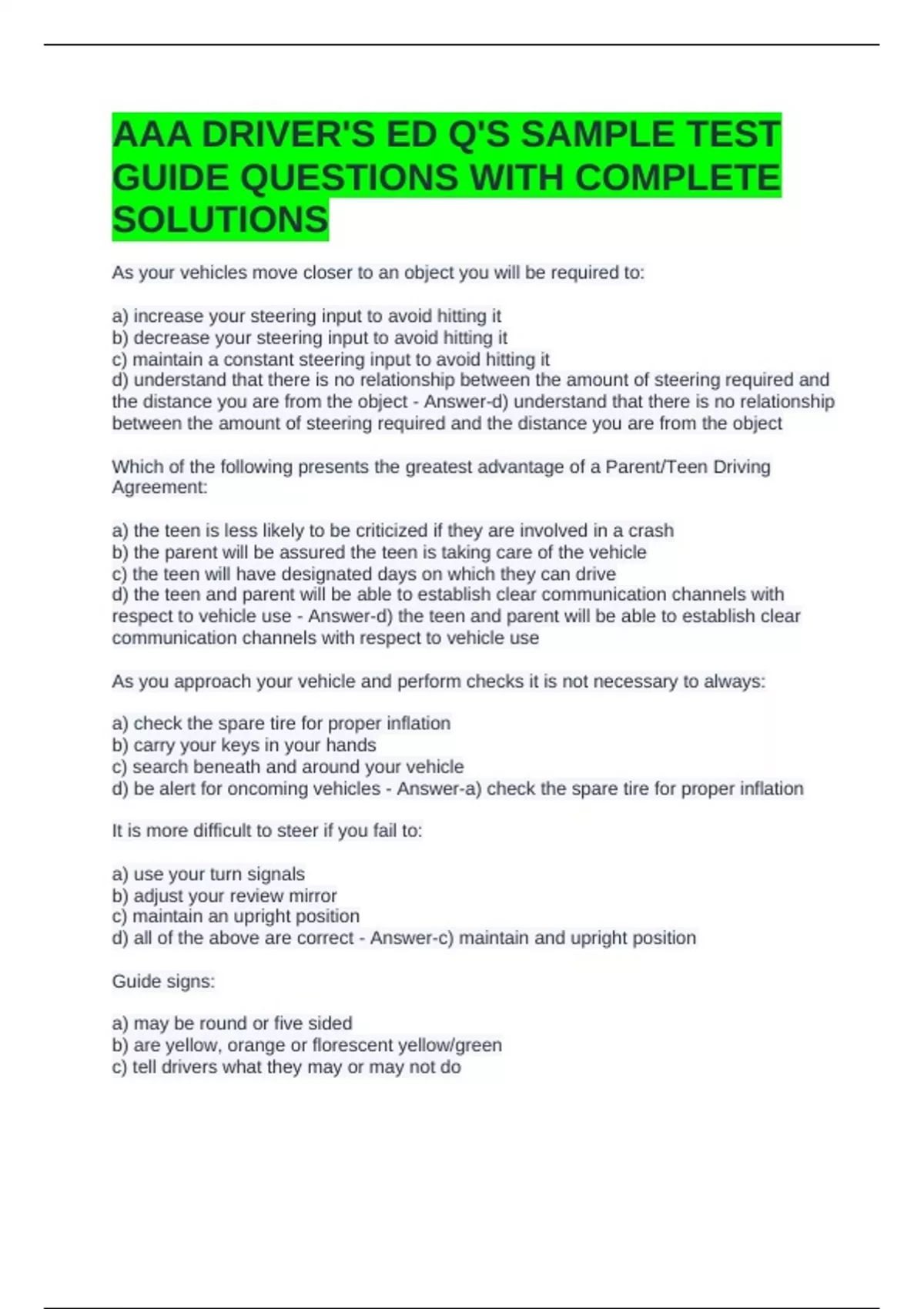 AAA DRIVER'S ED Q'S SAMPLE TEST GUIDE QUESTIONS WITH COMPLETE SOLUTIONS