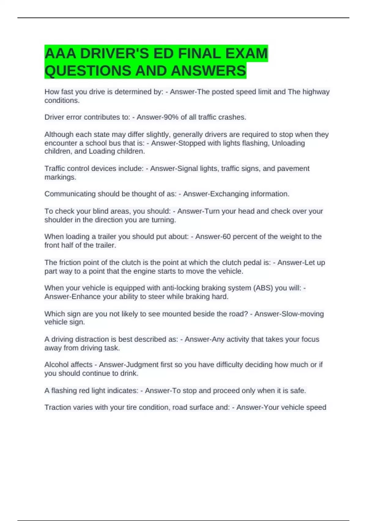 AAA DRIVER'S ED FINAL EXAM