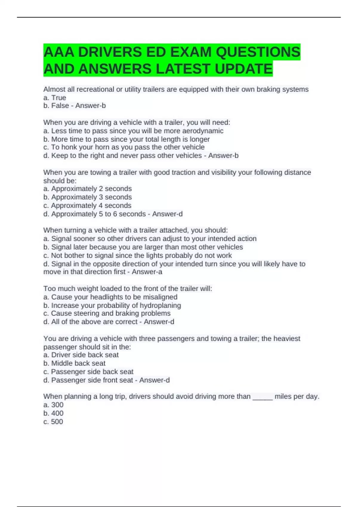 AAA DRIVERS ED EXAM QUESTIONS