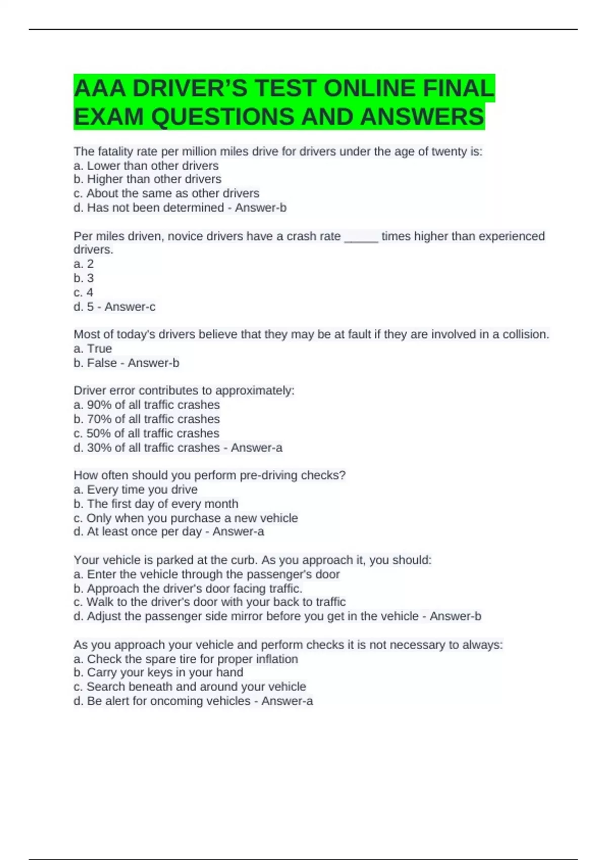AAA DRIVER’S TEST ONLINE FINAL EXAM QUESTIONS AND ANSWERS