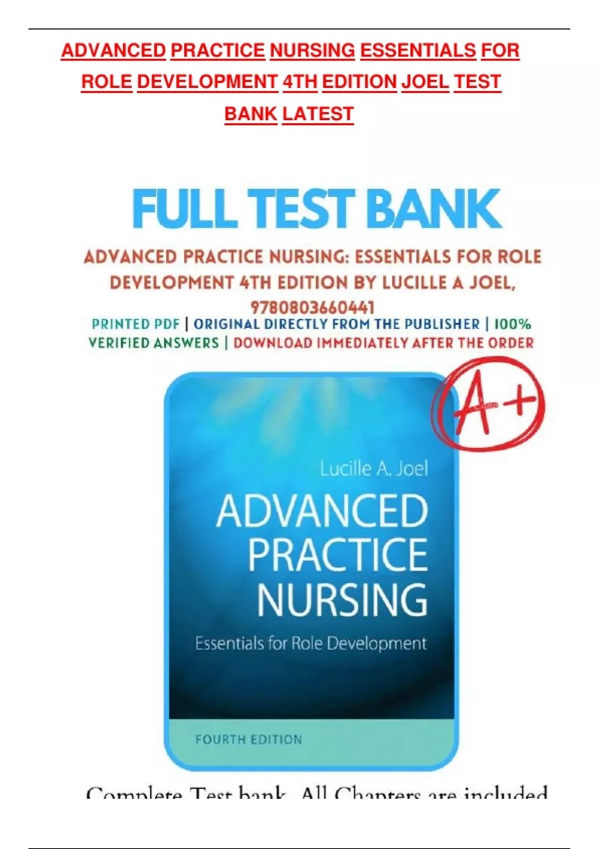 TEST BANK FOR ADVANCED PRACTICE NURSING ESSENTIALS FOR ROLE DEVELOPMENT 4TH EDITION JOEL |ISBN |All chapters included 1-16