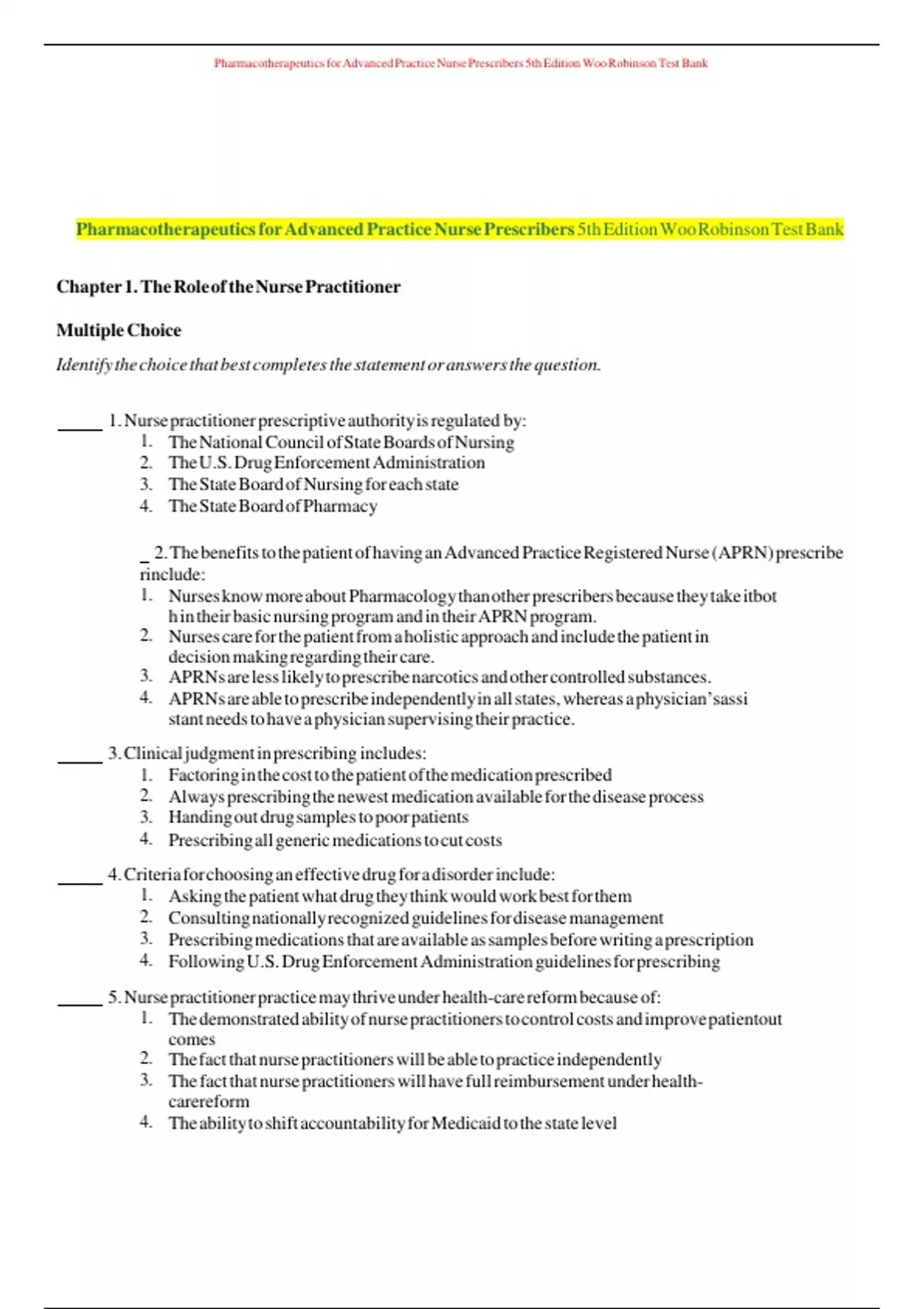 Test bank pharmacotherapeutics for advanced practice nurse prescribers 5th edition teri moser woo marylou