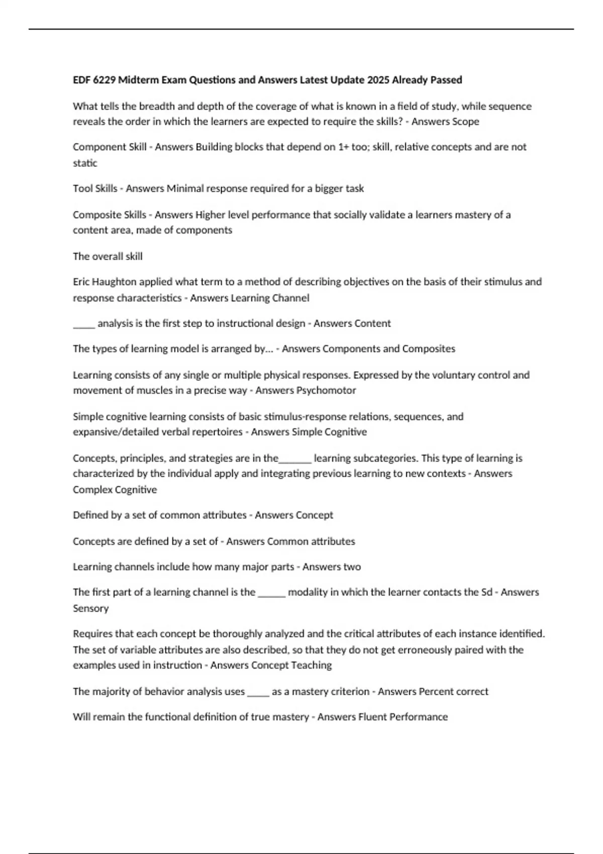 EDF 6229 Final Exam Questions and Answers Latest Update 2025 Already Passed Tool skills - Answers Minimal response sets that underpin all other skills (prerequisite skills) Component skills - Answers Combining one or more tool skills (building blocks) Composite skills - Answers Higher-level performances (ultimate goal) Psychomotor learning - Answers Consists of any single or multiple physical response; learning that involves how to move certain muscles in a precise way Simple cognitive learning - Answers Consists of a basic stimulus/response relationship; learning that includes relatively straightforward stimulus response relations Complex cognitive learning - Answers Demonstrates the ability to handle new situations; learning that involves the learner to respond functionally to concepts or to novel stimuli/situations Concept - Answers Defined by a set of common attributes found in each example of the concept Critical attributes - Answers Defines the things being taught Variable attributes - Answers Accompanies but doesn't define the thing being taught; purposely manipulated Uncontrolled attributes - Answers Accompanies but doesn't define the thing being taught; must be something we can control but choose not to Scope - Answers Shaping process that leads to mastery Learning channel - Answers How the learner makes sensory contact with the stimuli and how the learner responds to the stimuli A pinpoint consists of... - Answers learning channel, movement cycle, and context Behavioral fluency - Answers Defined by it's outcomes (RESA) Retention - Answers To perform at a comparable frequency after a period of no practice Endurance - Answers To perform for extended periods of time without fatigue Stability - Answers To perform without getting distracted Application - Answers To perform a more complex task or in a new setting Precision teaching - Answers A system for precisely defining and continuously measuring dimensional features of behavior and analyzing behavioral data on the SCC to make timely and effective data-based decisions to accelerate behavioral repertoires