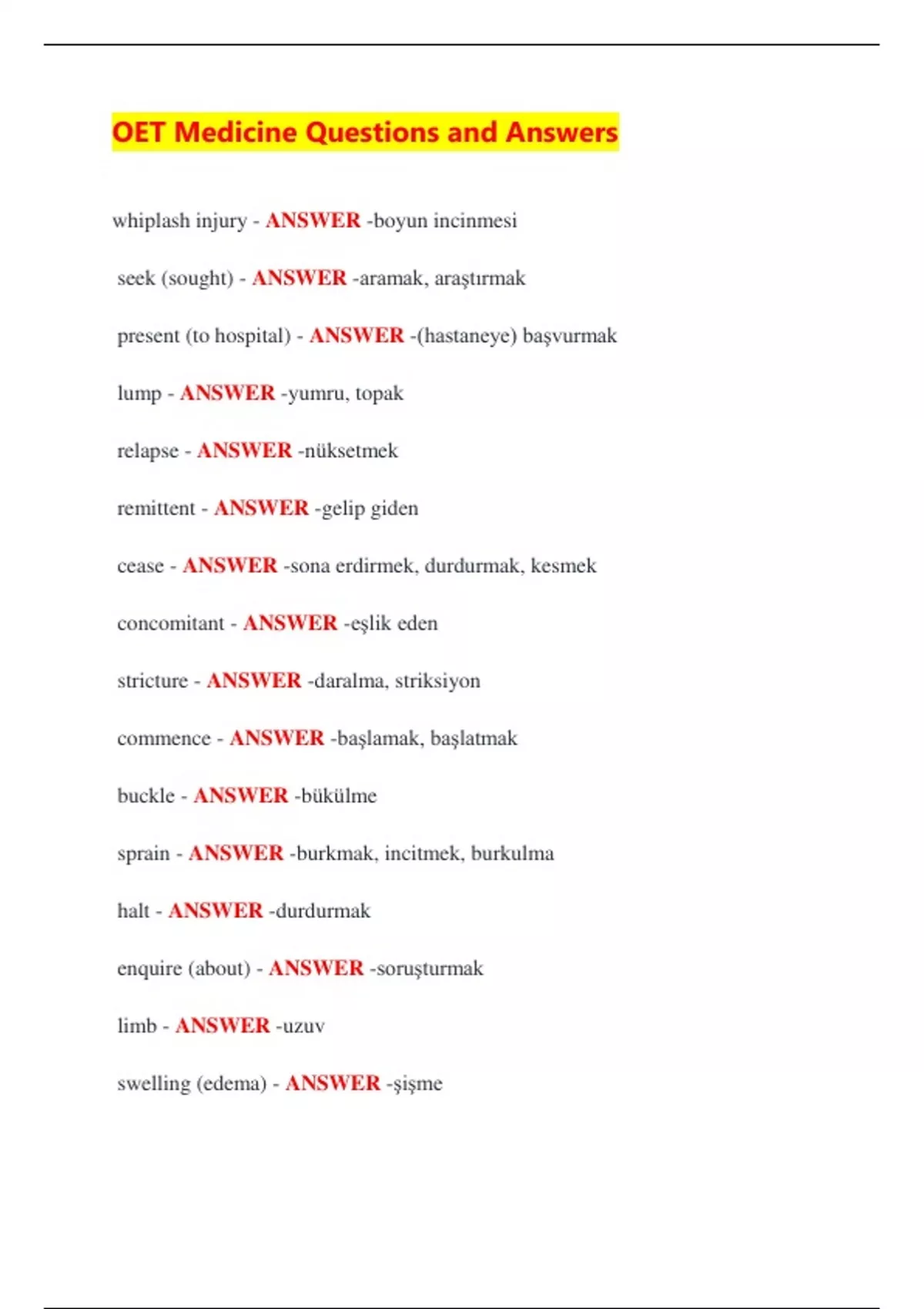 OET Medicine Questions and Answers whiplash injury - ANSWER -boyun incinmesi seek (sought) - ANSWER -aramak, araştırmak present (to hospital) - ANSWER -(hastaneye) başvurmak lump - ANSWER -yumru, topak relapse - ANSWER -nüksetmek remittent - ANSWER -gelip giden cease - ANSWER -sona erdirmek, durdurmak, kesmek concomitant - ANSWER -eşlik eden stricture - ANSWER -daralma, striksiyon commence - ANSWER -başlamak, başlatmak buckle - ANSWER -bükülme sprain - ANSWER -burkmak, incitmek, burkulma halt - ANSWER -durdurmak enquire (about) - ANSWER -soruşturmak limb - ANSWER -uzuv swelling (edema) - ANSWER -şişme pale - ANSWER -solgun, soluk throbbing - ANSWER -zonklama splint - ANSWER -atel, atellemek sling - ANSWER -kol askısı differential diagnosis - ANSWER -ayırıcı tanı insufficent - ANSWER -yetersiz sleep deprivation - ANSWER -uyku yoksunluğu reinforce - ANSWER -güçlendirmek, sağlamlaştırmak fortified foods - ANSWER -takviye edilmiş gıda chaperone - ANSWER -refakatçi insertion - ANSWER -ekleme, sokma addiction - ANSWER -bağımlılık substitute drug - ANSWER -muadil ilaç incentive - ANSWER -teşvik draw attention to - ANSWER -dikkati bir şeye çekmek cope with (stress) - ANSWER -(stresle) başa çıkmak mental breakdown - ANSWER -sinir krizi upbringing - ANSWER -yetiştirme, terbiye implication - ANSWER -ima, olası sonuç imprecise - ANSWER -kesin olmayan, dikkatsiz, özensiz genuine - ANSWER -hakiki, gerçek illicit - ANSWER -yasadışı afflict - ANSWER -acı vermek, başına bela olmak vague - ANSWER -belirsiz, net olmayan overwhelming - ANSWER -ezici, karşı konulamaz misdiagnosis - ANSWER -yanlış tanı scaffolding - ANSWER -destek stringent - ANSWER -sıkı, katı burden - ANSWER -yük, sorumluluk compound - ANSWER -bileşik, madde subsequent - ANSWER -sonraki, takip eden strive for - ANSWER -çaba sarf etmek, uğraşmak decline - ANSWER -reddetmek, azalmak relevant - ANSWER -ilgili, uygun undertake - ANSWER -(bir görevi) üstlenmek, yüklenmek