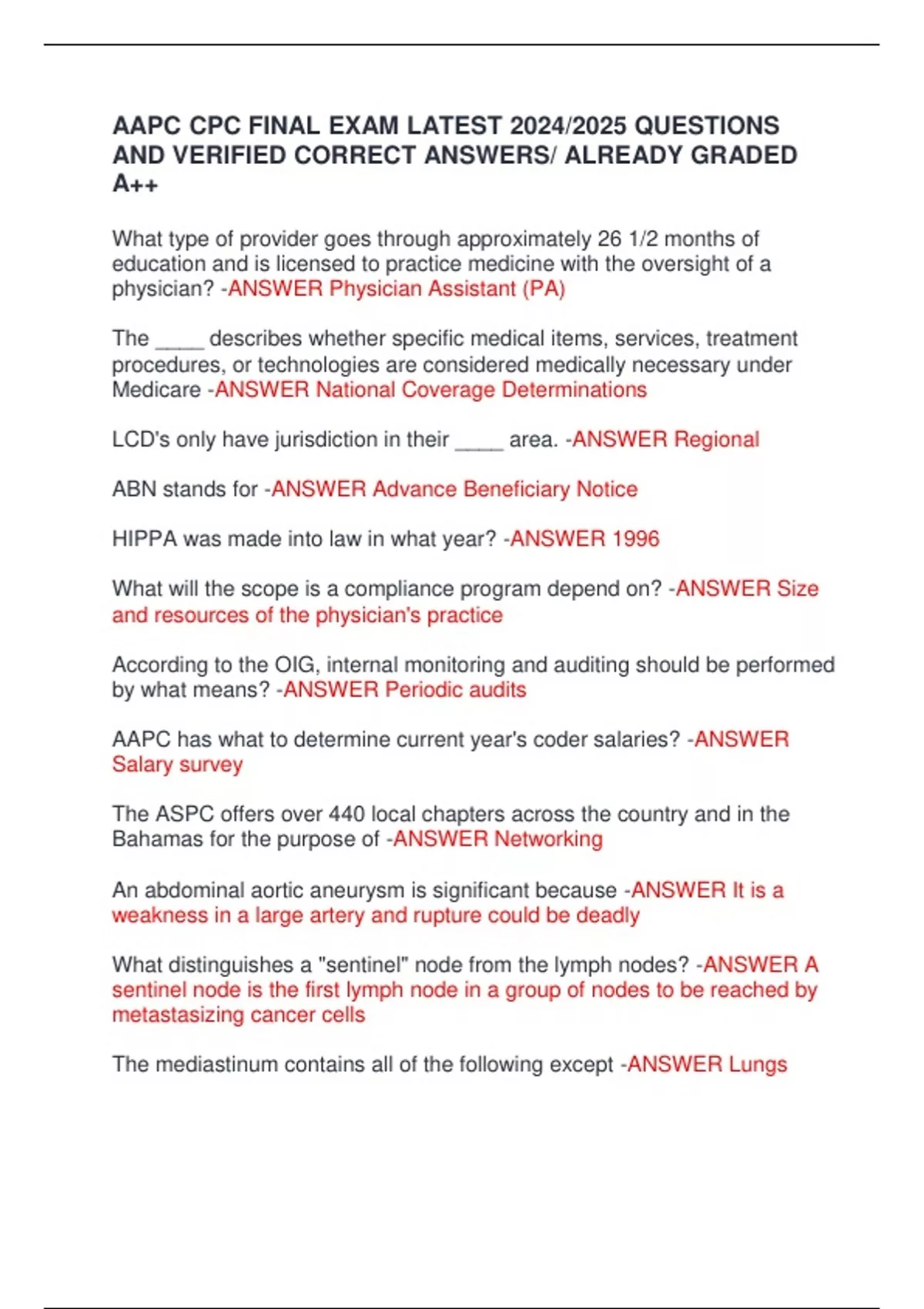 AAPC CPC FINAL EXAM LATEST 2024/2025 QUESTIONS AND VERIFIED CORRECT ANSWERS/ ALREADY GRADED A++ AAPC CPC FINAL EXAM LATEST 2024/2025 QUESTIONS AND VERIFIED CORRECT ANSWERS/ ALREADY GRADED A++