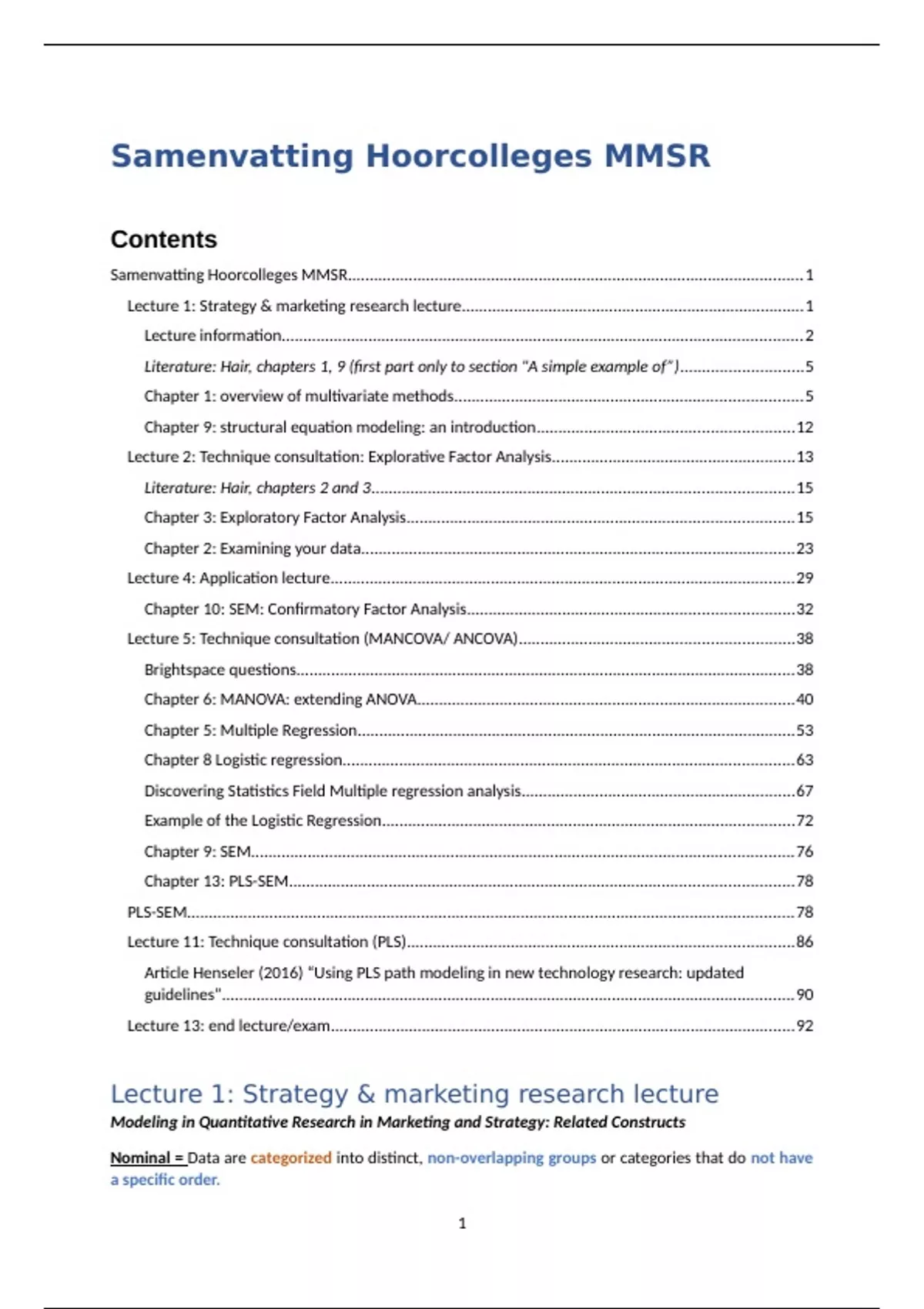 This document contains all the Hair chapters needed for the exam, very detailed written down and highlighted what is important. Article of Henseler, Hubona & Ray (2016) is summarized as well. All the lectures are added along the chapters to make it complete. Each chapter shows all the steps that need to be taken in the process of (for example) ANOVA, or PLS-SEM Everything you need is in this summary, that is why this one is longer than usual.