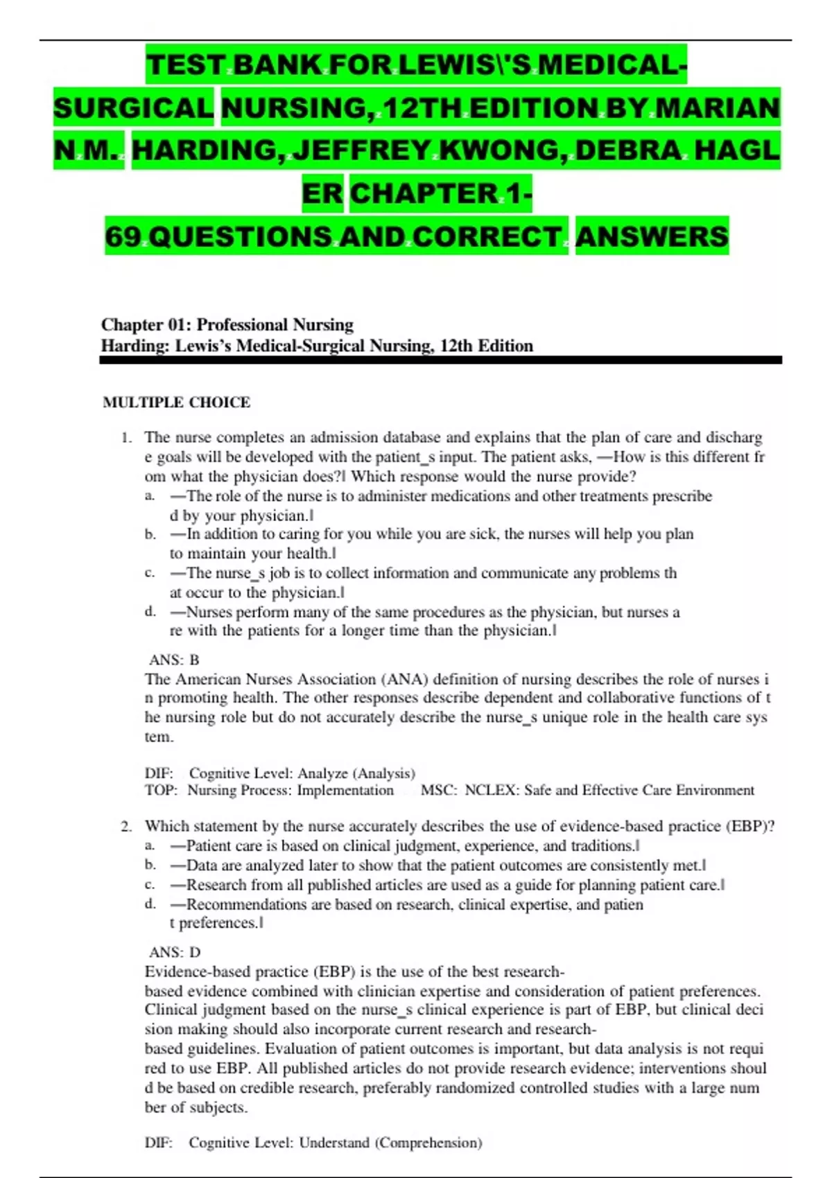TEST BANK FOR LEWIS'S MEDICAL-SURGICAL NURSING, 12TH EDITION BY MARIANN M. HARDING, JEFFREY KWONG, DEBRA HAGLER CHAPTER 1-69 QUESTIONS AND CORRECT ANSWERS
