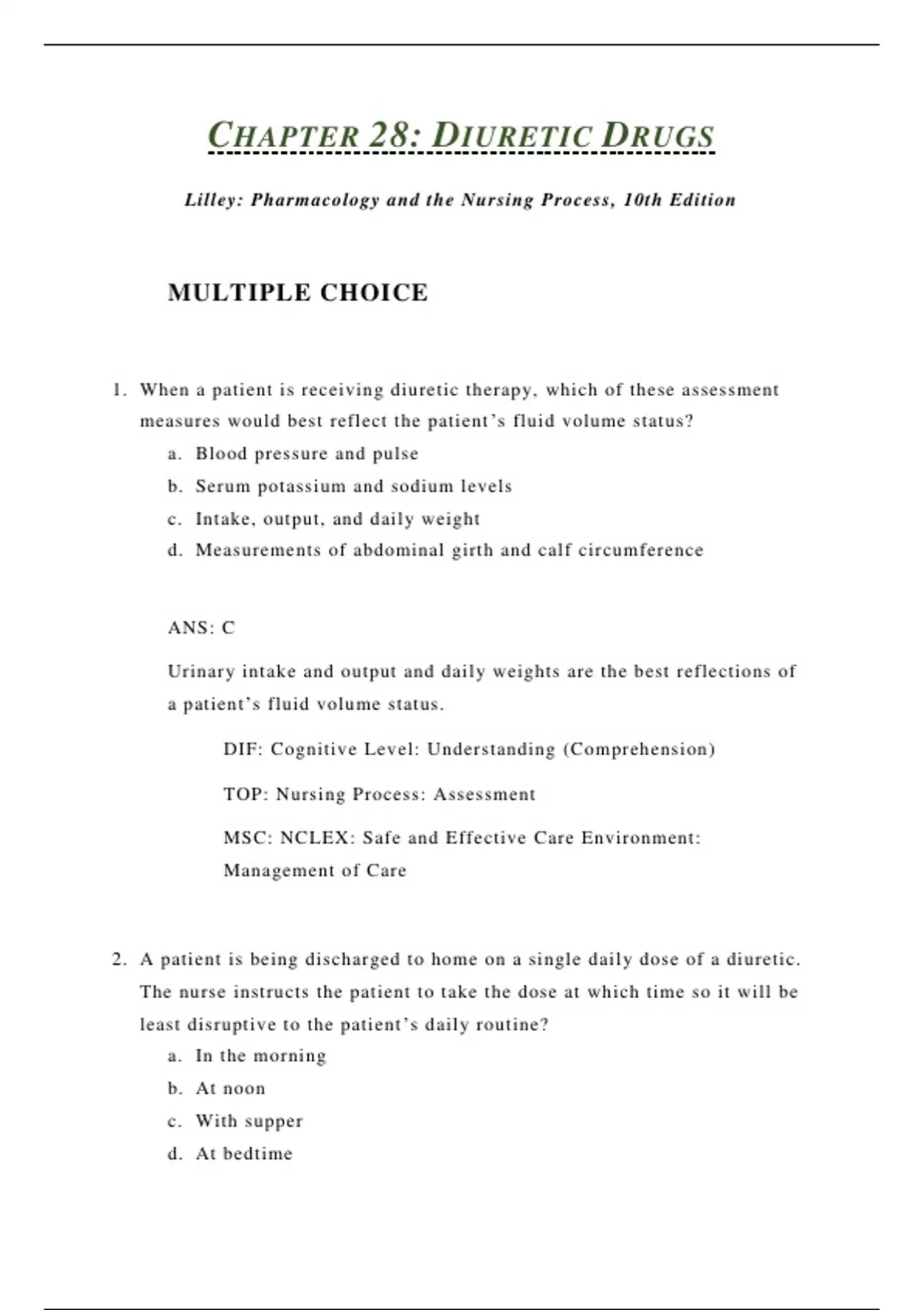 Lilley: Pharmacology and the Nursing Process, 10th Edition MULTIPLE CHOICE 1. When a patient is receiving diuretic therapy, which of these assessment measures would best reflect the patient’s fluid volume status? a. Blood pressure and pulse b. Serum potassium and sodium levels c. Intake, output, and daily weight d. Measurements of abdominal girth and calf circumference ANS: C Urinary intake and output and daily weights are the best reflections of a patient’s fluid volume status. DIF: Cognitive Level: Understanding (Comprehension) TOP: Nursing Process: Assessment MSC: NCLEX: Safe and Effective Care Environment: Management of Care 2. A patient is being discharged to home on a single daily dose of a diuretic. The nurse instructs the patient to take the dose at which time so it will be least disruptive to the patient’s daily routine? a. In the morning b. At noon c. With supper d. At bedtime ANS: A It is better to take the diuretic medication early in the morning to prevent urination during the night. Taking the diuretic at the other times may cause night-time urination and disrupt sleep. DIF: Cognitive Level: Applying (Application) TOP: Nursing Process: Implementation MSC: NCLEX: Safe and Effective Care Environment: Management of Care 3. A patient is started on a diuretic for antihypertensive therapy. The nurse expects that a drug in which class is likely to be used initially? a. Loop diuretics b. Osmotic diuretics c. Thiazide diuretics d. Potassium-sparing diuretics
