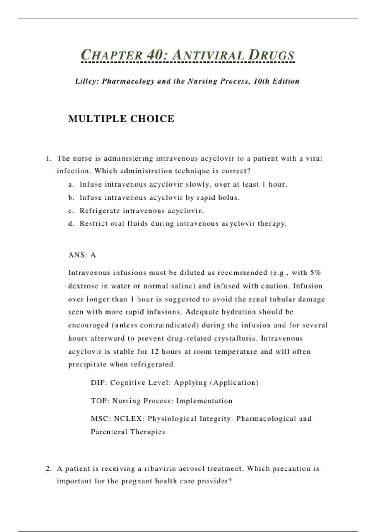 Lilley: Pharmacology and the Nursing Process, 10th Edition MULTIPLE CHOICE 1. The nurse is administering intravenous acyclovir to a patient with a viral infection. Which administration technique is correct? a. Infuse intravenous acyclovir slowly, over at least 1 hour. b. Infuse intravenous acyclovir by rapid bolus. c. Refrigerate intravenous acyclovir. d. Restrict oral fluids during intravenous acyclovir therapy. ANS: A Intravenous infusions must be diluted as recommended (e.g., with 5% dextrose in water or normal saline) and infused with caution. Infusion over longer than 1 hour is suggested to avoid the renal tubular damage seen with more rapid infusions. Adequate hydration should be encouraged (unless contraindicated) during the infusion and for several hours afterward to prevent drug-related crystalluria. Intravenous acyclovir is stable for 12 hours at room temperature and will often precipitate when refrigerated. DIF: Cognitive Level: Applying (Application) TOP: Nursing Process: Implementation MSC: NCLEX: Physiological Integrity: Pharmacological and Parenteral Therapies 2. A patient is receiving a ribavirin aerosol treatment. Which precaution is important for the pregnant health care provider? a. No special precautions are needed. b. Wearing a mask while in the room during the treatment. c. Staying out of the room during the aerosol treatment. d. Limiting exposure to the aerosol treatment to a maximum of 15 minutes per shift. ANS: C Pregnant health care providers or those wishing to become pregnant must stay out of the patient rooms when the aerosol form is being administered, due to the potential for secondhand inhalation on the part of the health care provider. Ribavirin is classified as a pregnancy category X drug and carries a black box warning relating to significant teratogenic and/or embryocidal effects. The other options are incorrect. DIF: Cognitive Level: Applying (Application) TOP: Nursing Process: Planning MSC: NCLEX: Physiological Integrity: Reduction of Risk Potential 3. A patient is taking a combination of antiviral drugs as treatment for early stages of a viral infection. While discussing the drug therapy, the patient asks the nurse if the drugs will kill the virus. When answering, the nurse keeps in mind which fact about antiviral drugs? a. They are given for palliative reasons only. b. They will be effective as long as the patient is not exposed to the virus again. c. They can be given in large enough doses to eradicate the virus without harming the body’s healthy cells. d. They may also kill healthy cells while killing viruses.