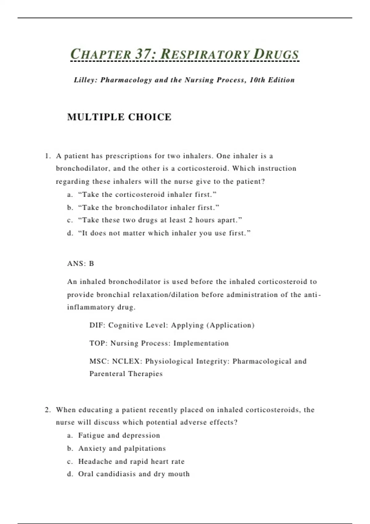Lilley: Pharmacology and the Nursing Process, 10th Edition MULTIPLE CHOICE 1. A patient has prescriptions for two inhalers. One inhaler is a bronchodilator, and the other is a corticosteroid. Which instruction regarding these inhalers will the nurse give to the patient? a. “Take the corticosteroid inhaler first.” b. “Take the bronchodilator inhaler first.” c. “Take these two drugs at least 2 hours apart.” d. “It does not matter which inhaler you use first.” ANS: B An inhaled bronchodilator is used before the inhaled corticosteroid to provide bronchial relaxation/dilation before administration of the anti-inflammatory drug. DIF: Cognitive Level: Applying (Application) TOP: Nursing Process: Implementation MSC: NCLEX: Physiological Integrity: Pharmacological and Parenteral Therapies 2. When educating a patient recently placed on inhaled corticosteroids, the nurse will discuss which potential adverse effects? a. Fatigue and depression b. Anxiety and palpitations c. Headache and rapid heart rate d. Oral candidiasis and dry mouth ANS: D Oral candidiasis and dry mouth are two possible adverse effects of inhaled corticosteroids. The other responses are incorrect. DIF: Cognitive Level: Understanding (Comprehension) TOP: Nursing Process: Planning MSC: NCLEX: Physiological Integrity: Reduction of Risk Potential 3. The nurse is monitoring drug levels for a patient who is receiving theophylline. The most recent theophylline level was 22 mcg/mL, and the nurse evaluates this level to be a. below the therapeutic level. b. at a therapeutic level. c. above the therapeutic level. d. at a toxic level.