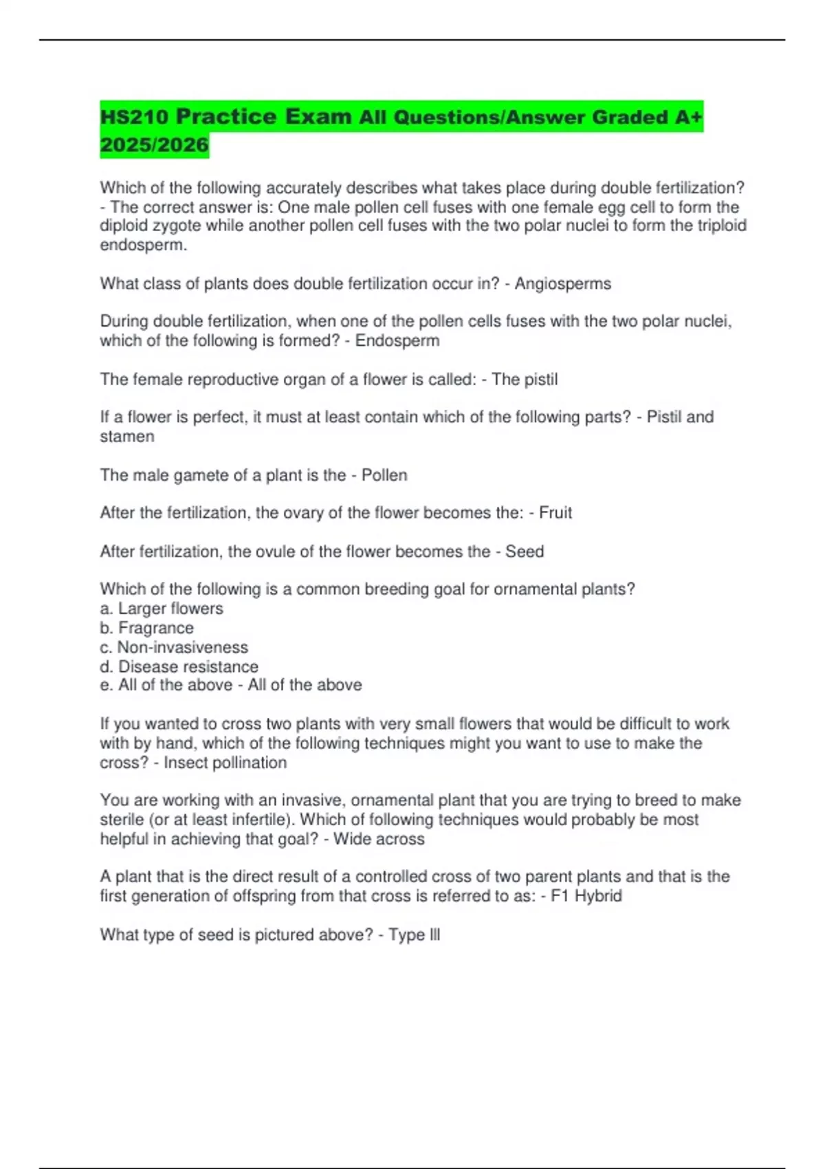 HS210 Practice Exam All Questions/Answer Graded A+ 2025/2026 Which of the following accurately describes what takes place during double fertilization? - The correct answer is: One male pollen cell fuses with one female egg cell to form the diploid zygote while another pollen cell fuses with the two polar nuclei to form the triploid endosperm. What class of plants does double fertilization occur in? - Angiosperms During double fertilization, when one of the pollen cells fuses with the two polar nuclei, which of the following is formed? - Endosperm The female reproductive organ of a flower is called: - The pistil If a flower is perfect, it must at least contain which of the following parts? - Pistil and stamen The male gamete of a plant is the - Pollen After the fertilization, the ovary of the flower becomes the: - Fruit After fertilization, the ovule of the flower becomes the - Seed