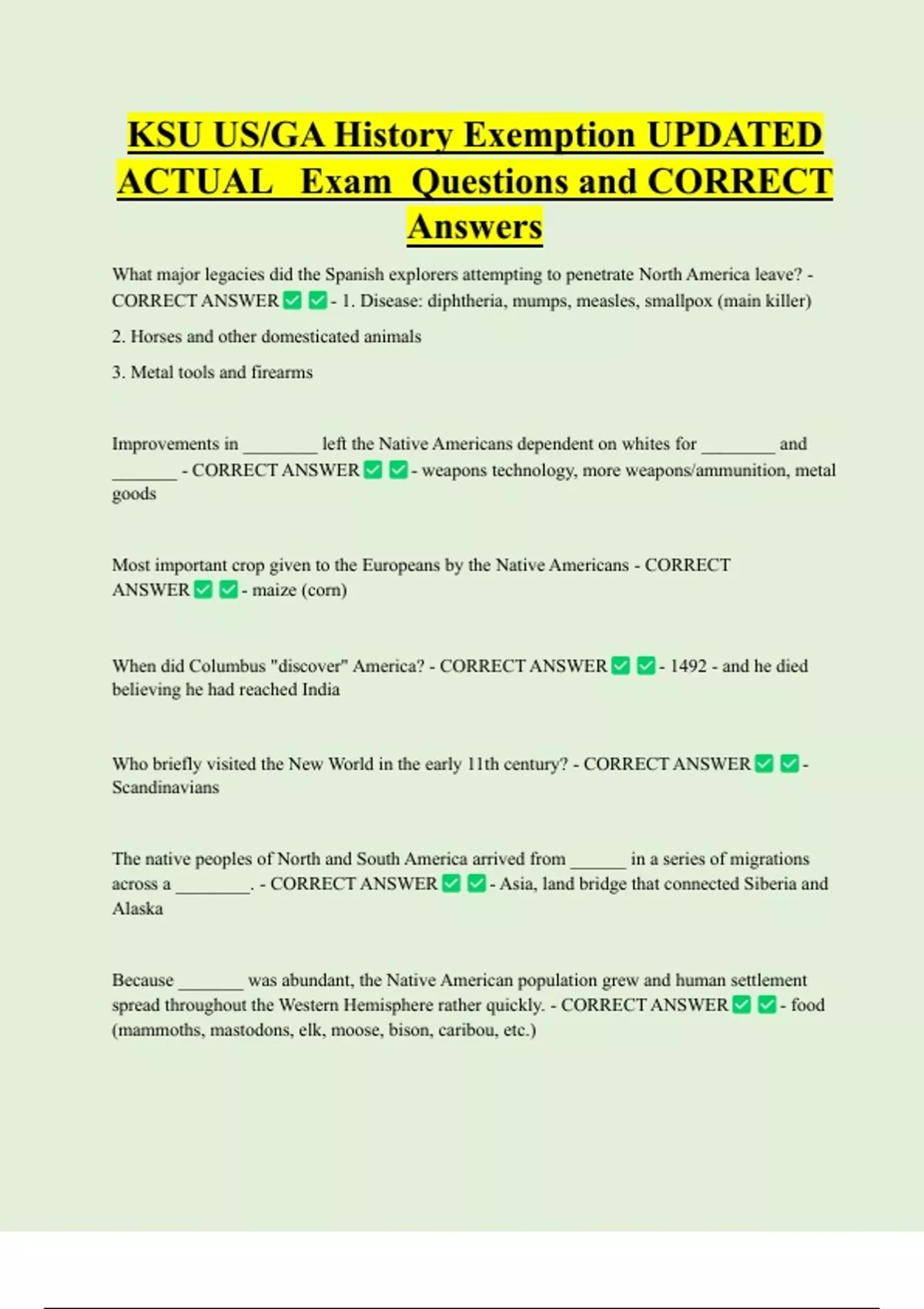KSU US/GA History Exemption UPDATED ACTUAL Exam Questions and CORRECT Answers What major legacies did the Spanish explorers attempting to penetrate North America leave? - CORRECT ANSWER - 1. Disease: diphtheria, mumps, measles, smallpox (main killer) 2. Horses and other domesticated animals 3. Metal tools and firearms