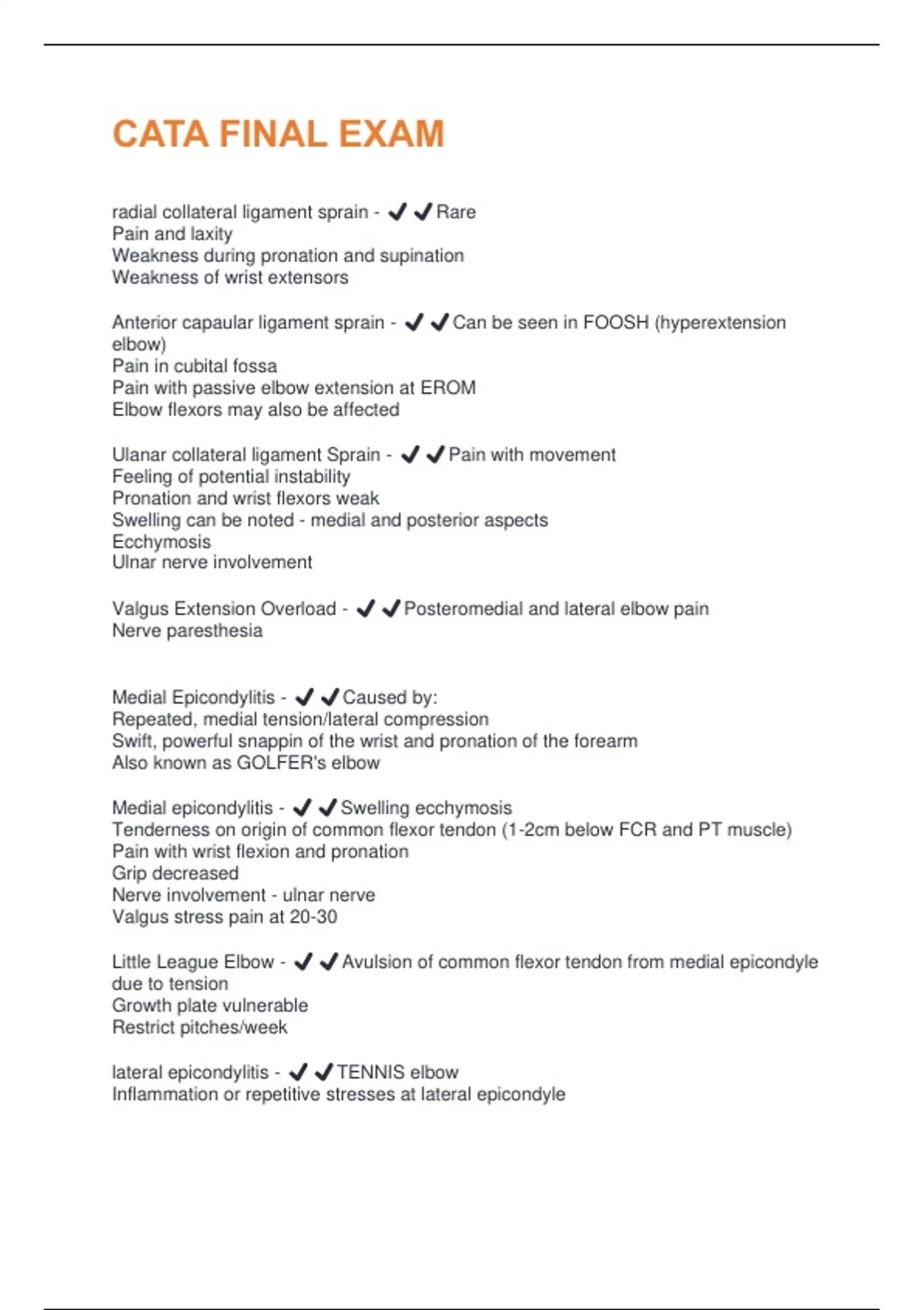 radial collateral ligament sprain - ️️Rare Pain and laxity Weakness during pronation and supination Weakness of wrist extensors Anterior capaular ligament sprain - ️️Can be seen in FOOSH (hyperextension elbow) Pain in cubital fossa Pain with passive elbow extension at EROM Elbow flexors may also be affected Ulanar collateral ligament Sprain - ️️Pain with movement Feeling of potential instability Pronation and wrist flexors weak Swelling can be noted - medial and posterior aspects Ecchymosis Ulnar nerve involvement Valgus Extension Overload - ️️Posteromedial and lateral elbow pain Nerve paresthesia Medial Epicondylitis - ️️Caused by: Repeated, medial tension/lateral compression Swift, powerful snappin of the wrist and pronation of the forearm Also known as GOLFER's elbow