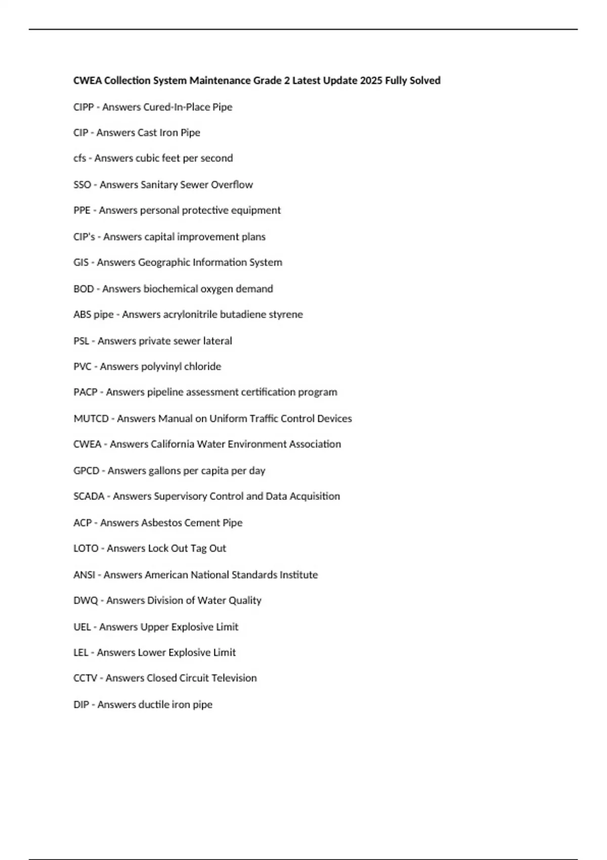 CWEA Collection System Maintenance Grade 2 Latest Update 2025 Fully Solved CIPP - Answers Cured-In-Place Pipe CIP - Answers Cast Iron Pipe cfs - Answers cubic feet per second SSO - Answers Sanitary Sewer Overflow PPE - Answers personal protective equipment CIP's - Answers capital improvement plans GIS - Answers Geographic Information System BOD - Answers biochemical oxygen demand ABS pipe - Answers acrylonitrile butadiene styrene PSL - Answers private sewer lateral PVC - Answers polyvinyl chloride PACP - Answers pipeline assessment certification program MUTCD - Answers Manual on Uniform Traffic Control Devices CWEA - Answers California Water Environment Association GPCD - Answers gallons per capita per day SCADA - Answers Supervisory Control and Data Acquisition ACP - Answers Asbestos Cement Pipe LOTO - Answers Lock Out Tag Out ANSI - Answers American National Standards Institute DWQ - Answers Division of Water Quality UEL - Answers Upper Explosive Limit LEL - Answers Lower Explosive Limit CCTV - Answers Closed Circuit Television DIP - Answers ductile iron pipe SSMP - Answers sewer system management plan IDLH - Answers Immediately Dangerous to Life and Health FOG - Answers fats, oils, grease MSDS - Answers Material Safety Data Sheet SDS - Answers Safety Data Sheet PLC - Answers Programmable Logic Controller TTC - Answers Temporary Traffic Control I/I - Answers Infiltration and Inflow