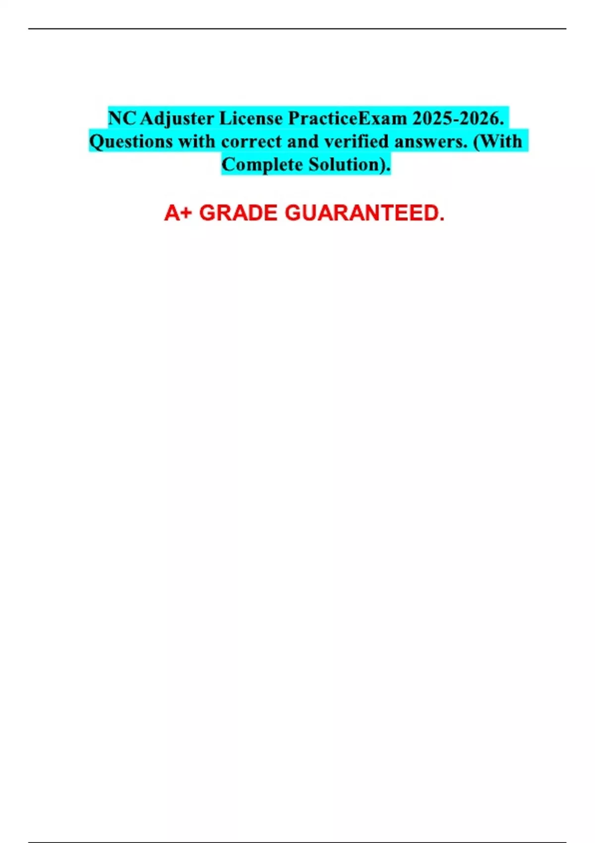NC Adjuster License Practice Exam . Questions with correct and verified answers. (With Complete Solution). A+ GRADE GUARANTEED.