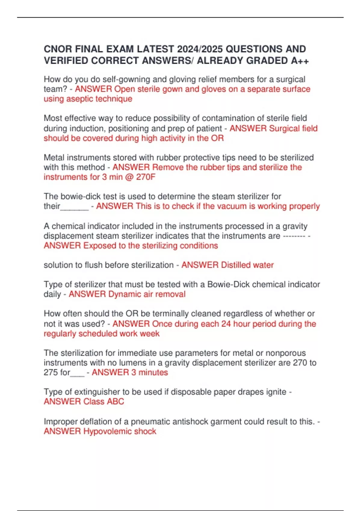 CNOR FINAL EXAM LATEST 2024/2025 QUESTIONS AND VERIFIED CORRECT ANSWERS/ ALREADY GRADED A++ CNOR FINAL EXAM LATEST 2024/2025 QUESTIONS AND VERIFIED CORRECT ANSWERS/ ALREADY GRADED A++