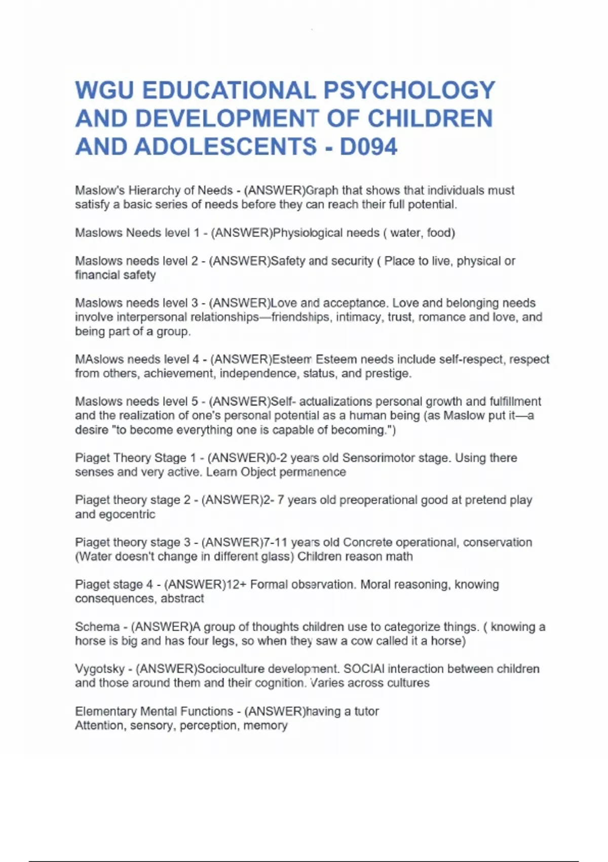 WGU EDUCATIONAL PSYCHOLOGY AND DEVELOPMENT OF CHILDREN AND ADOLESCENTS - D094 Maslow's Hierarchy of Needs - (ANSWER)Graph that shows that individuals must satisfy a basic series of needs before they can reach their full potential. Maslows Needs level 1 - (ANSWER)Physiological needs ( water, food) Maslows needs level 2 - (ANSWER)Safety and security ( Place to live, physical or financial safety Maslows needs level 3 - (ANSWER)Love and acceptance. Love and belonging needs involve interpersonal relationships—friendships, intimacy, trust, romance and love, and being part of a group. MAslows needs level 4 - (ANSWER)Esteem Esteem needs include self-respect, respect from others, achievement, independence, status, and prestige. Maslows needs level 5 - (ANSWER)Self- actualizations personal growth and fulfillment and the realization of one's personal potential as a human being (as Maslow put it—a desire "to become everything one is capable of becoming.") Piaget Theory Stage 1 - (ANSWER)0-2 years old Sensorimotor stage. Using there senses and very active. Learn Object permanence Piaget theory stage 2 - (ANSWER)2- 7 years old preoperational good at pretend play and egocentric Piaget theory stage 3 - (ANSWER)7-11 years old Concrete operational, conservation (Water doesn't change in different glass) Children reason math Piaget stage 4 - (ANSWER)12+ Formal observation. Moral reasoning, knowing consequences, abstract Schema - (ANSWER)A group of thoughts children use to categorize things. ( knowing a horse is big and has four legs, so when they saw a cow called it a horse) Vygotsky - (ANSWER)Socioculture development. SOCIAl interaction between children and those around them and their cognition. Varies across cultures Elementary Mental Functions - (ANSWER)having a tutor Attention, sensory, perception, memory