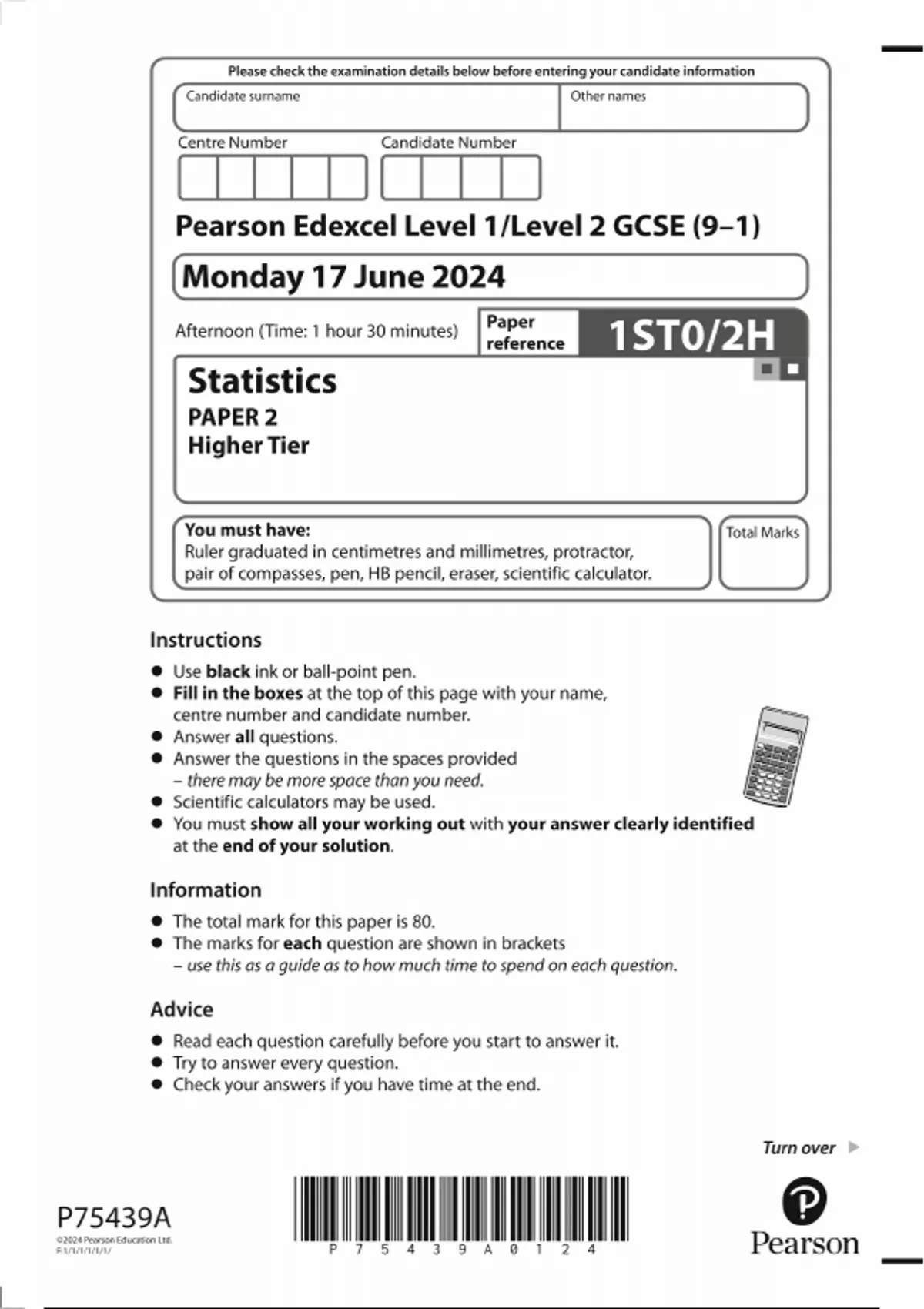 2024 Pearson Edexcel GCSE Statistics Paper 2 (1STO/2H :Higher Tier)