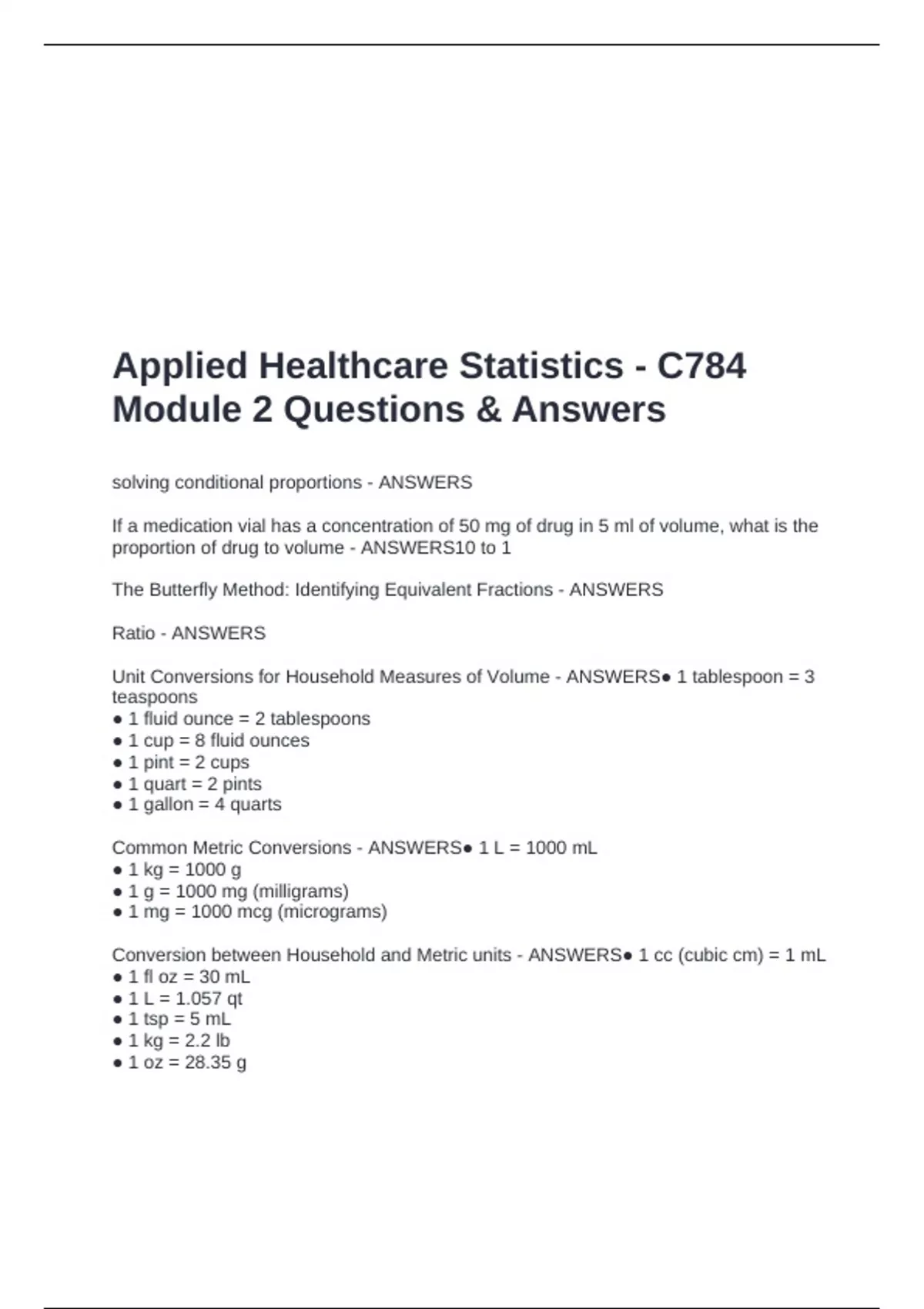 solving conditional proportions - ANSWERS If a medication vial has a concentration of 50 mg of drug in 5 ml of volume, what is the proportion of drug to volume - ANSWERS10 to 1 The Butterfly Method: Identifying Equivalent Fractions - ANSWERS Ratio - ANSWERS Unit Conversions for Household Measures of Volume - ANSWERS● 1 tablespoon = 3 teaspoons ● 1 fluid ounce = 2 tablespoons ● 1 cup = 8 fluid ounces ● 1 pint = 2 cups ● 1 quart = 2 pints ● 1 gallon = 4 quarts Common Metric Conversions - ANSWERS● 1 L = 1000 mL ● 1 kg = 1000 g ● 1 g = 1000 mg (milligrams) ● 1 mg = 1000 mcg (micrograms) Conversion between Household and Metric units - ANSWERS● 1 cc (cubic cm) = 1 mL ● 1 fl oz = 30 mL ● 1 L = 1.057 qt ● 1 tsp = 5 mL ● 1 kg = 2.2 lb ● 1 oz = 28.35 g