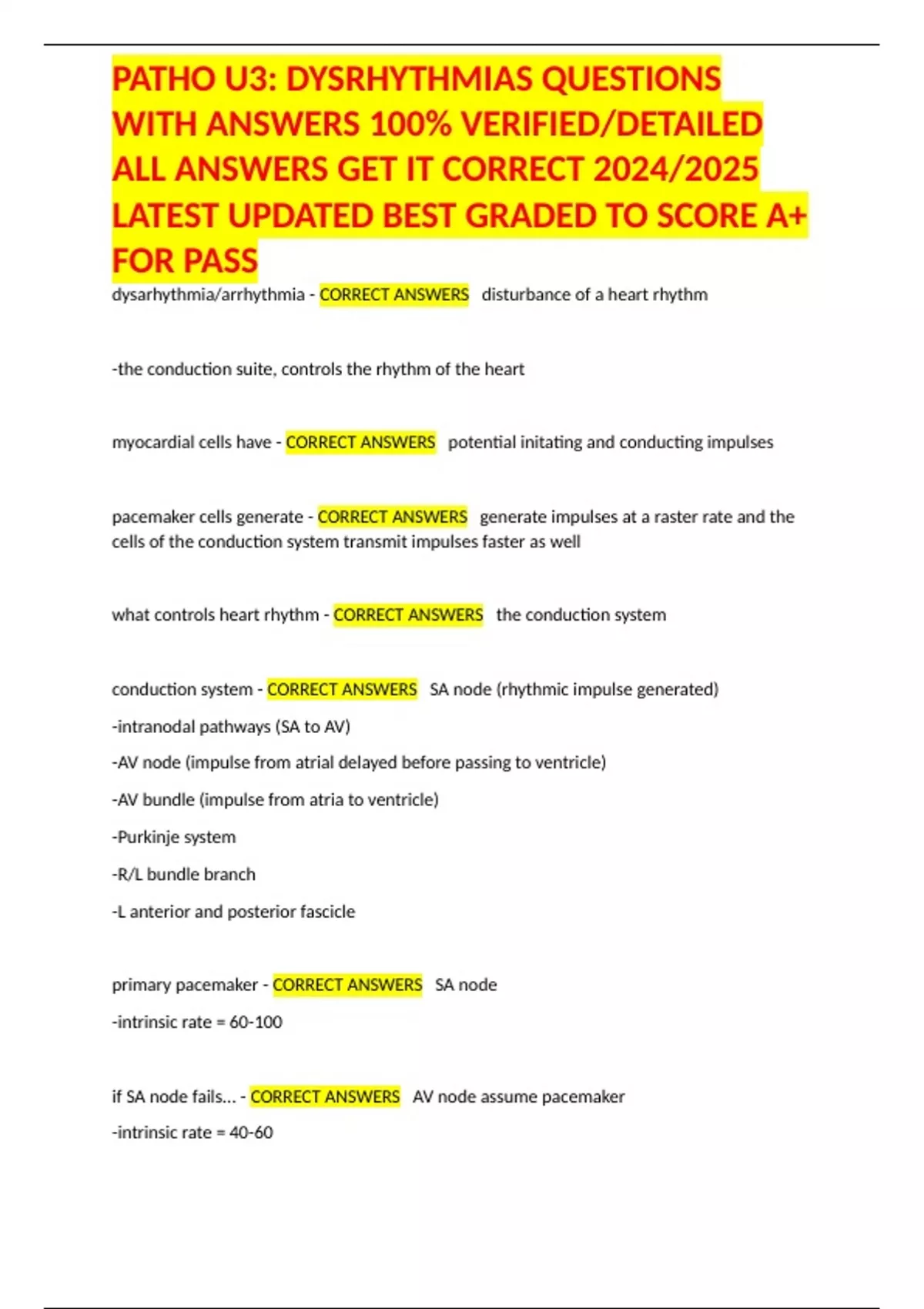 conduction system - CORRECT ANSWERS SA node (rhythmic impulse generated)
