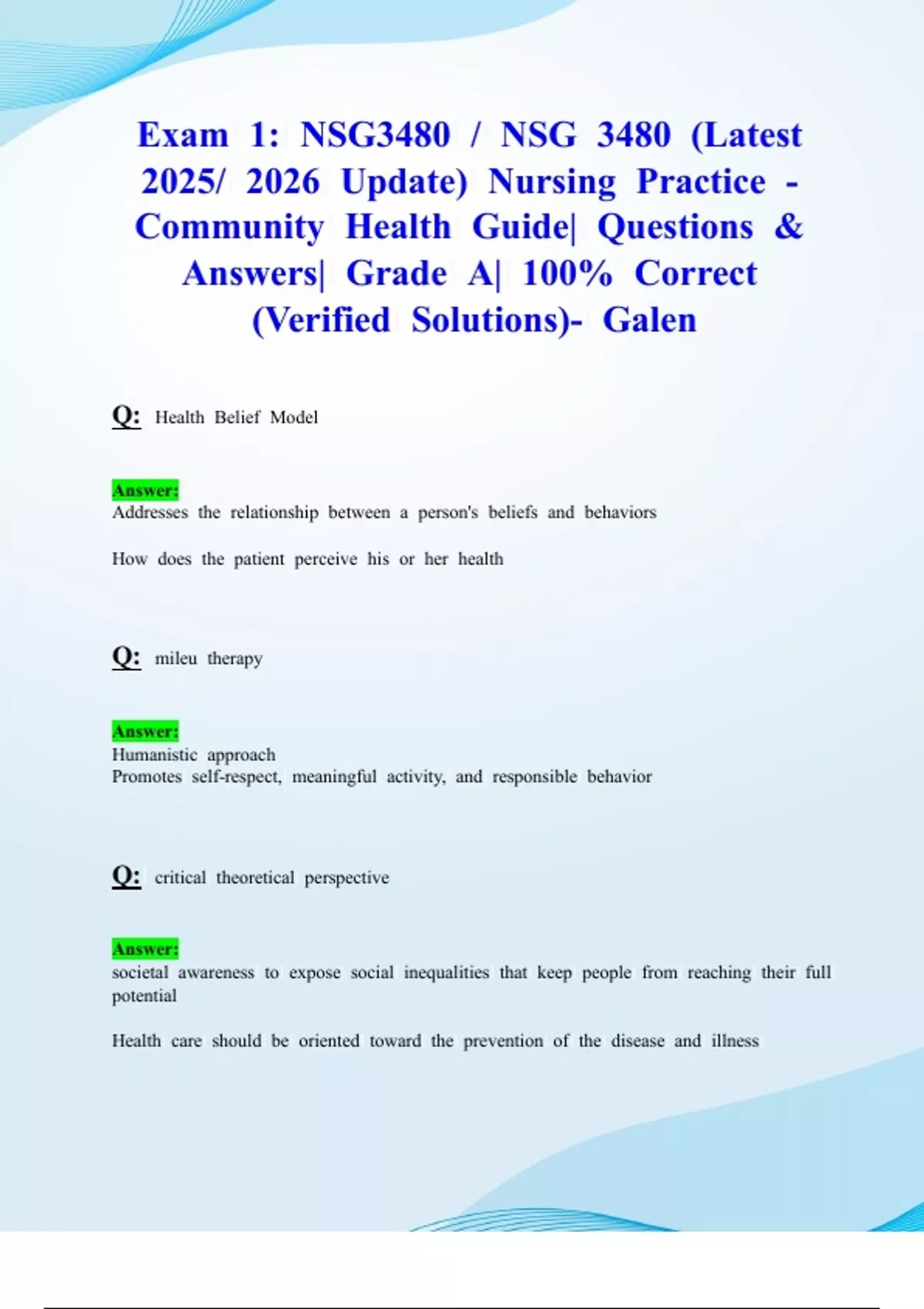 Exam 1: NSG3480 / NSG 3480 (Latest 2025/ 2026 Update) Nursing Practice - Community Health Guide| Questions & Answers| Grade A| 100% Correct (Verified Solutions)- Galen Q: Health Belief Model Answer: Addresses the relationship between a person's beliefs and behaviors How does the patient perceive his or her health Q: mileu therapy Answer: Humanistic approach Promotes self-respect, meaningful activity, and responsible behavior Q: critical theoretical perspective Answer: societal awareness to expose social inequalities that keep people from reaching their full potential Health care should be oriented toward the prevention of the disease and illness The priorities should not be based on the needs of the physicians, but rather the patients/population Q: Nurses can use both an upstream and a downstream approach to address health issues through ____________. Answer: Critical interactionism Q: Explores biopsychosocial factors that influence individuals to pursue health promotion activities Answer: Penders health promotion model Q: Combines several theories of intervention, constructs of the model includes self-efficacy and the process of change Answer: Transtheoretical model Q: Assumption that all behavior is determined by ones behavioral intentions Answer: Theory of reasoned action Q: Pender's Health Promotion Model Answer: does not consider health risk as factor that provokes change; examines factors that promote and protect health (personal factors, emotions, attitudes of others) health promotion Q: Health Belief Model (HBM) Answer: a non-stage theory that identifies three beliefs that influence decision making regarding health behavior: perceived susceptibility to a health threat, perceived severity of the disease or condition, and perceived benefits of and barriers to the behavior Q: Milio's Framework for Prevention Answer: Complements the health belief model. Emphasizes change at the community level. Identifies relationship between health deficits and availability of health-promoting resources. Theorizes that behavior changes within a large number of people can ultimately lead to social change. Q: critical theoretical perspective Answer: uses societal awareness to expose social inequalities that keep people from reaching their full potential Q: Theory of Reasoned Action Answer: