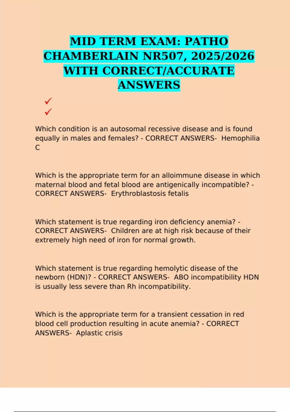 MID TERM EXAM: PATHO CHAMBERLAIN NR507, 2025/2026 WITH CORRECT/ACCURATE ANSWERS