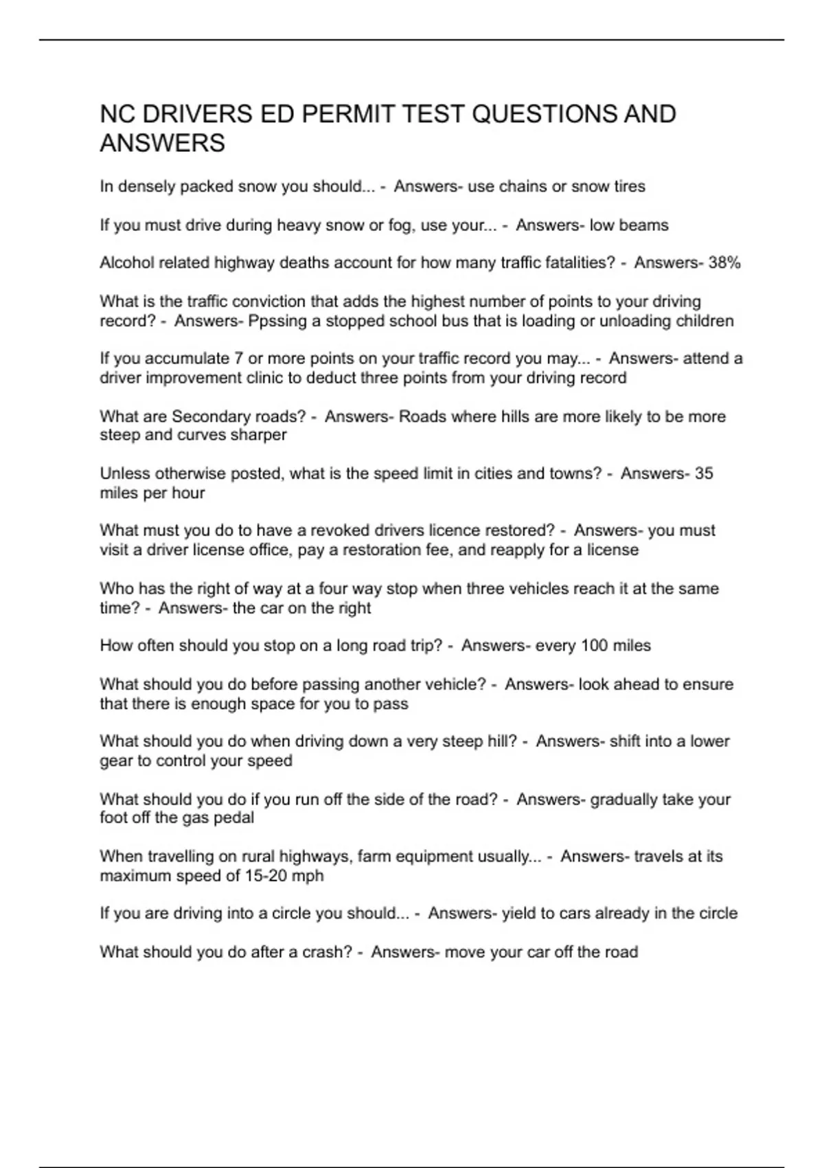 NC DRIVERS ED PERMIT TEST QUESTIONS AND