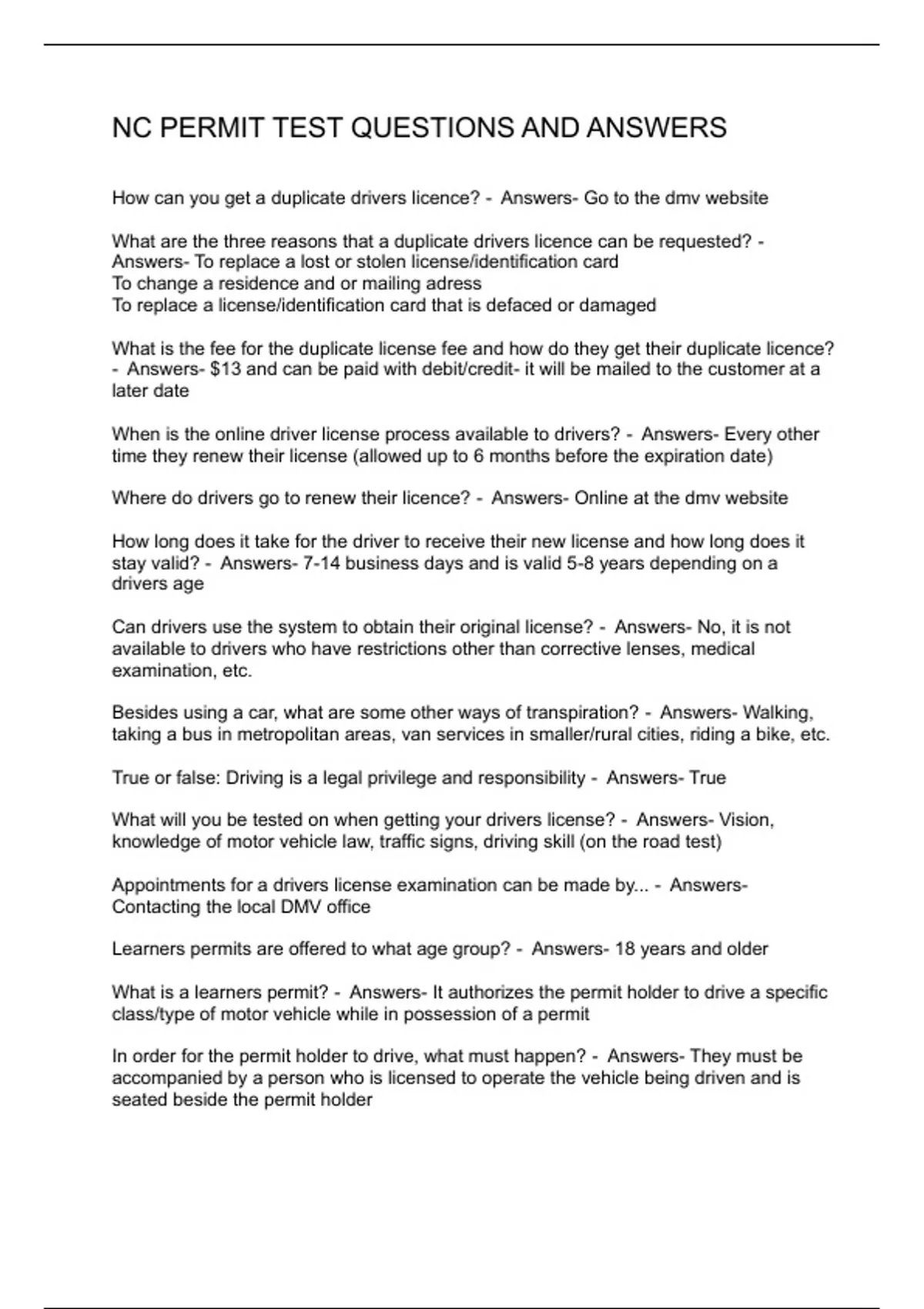 NC PERMIT TEST QUESTIONS AND ANSWERS
