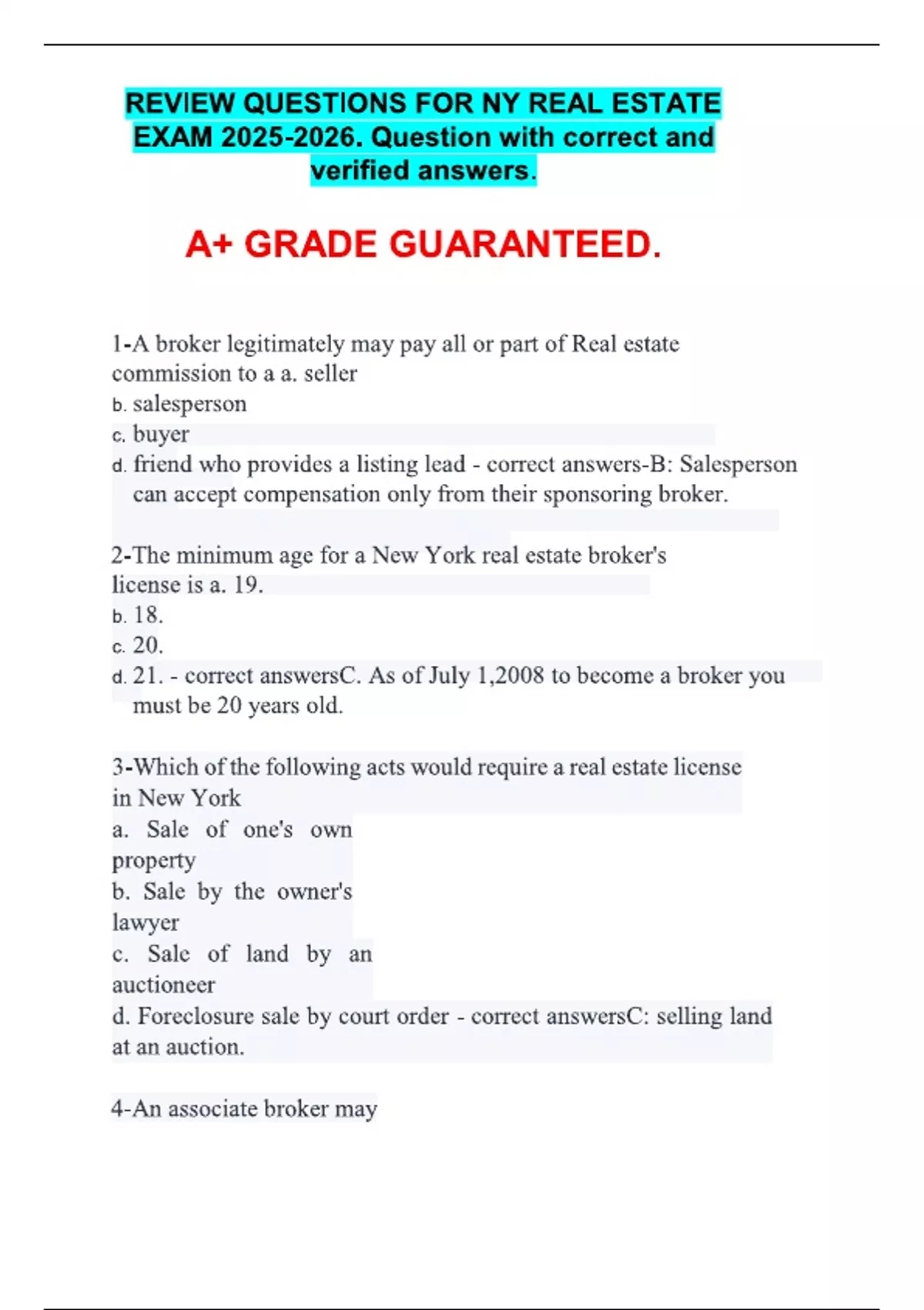 REVIEW QUESTIONS FOR NY REAL ESTATE EXAM . Question with correct and verified answers. A+ GRADE GUARANTEED. 1-A broker legitimately may pay all or part of Real estate commission to a a. seller b. salesperson c. buyer d. friend who provides a listing lead - correct answers-B: Salesperson can accept compensation only from their sponsoring broker. 2-The minimum age for a New York real estate broker's license is a. 19. b. 18. c. 20. d. 21. - correct answersC. As of July 1,2008 to become a broker you must be 20 years old. 3-Which of the following acts would require a real estate license in New York a. Sale of one's own property b. Sale by the owner's lawyer c. Sale of land by an auctioneer d. Foreclosure sale by court order - correct answersC: selling land at an auction. 4-An associate broker may a. sponsor a person for a salesperson's license. b. collect his or her own real estate fees. c. act as a principal broker for another broker. d. Work as a salesperson for a principal broker - correct answersD: Associate broker is a licensed broker but chooses to work under the supervision of another broker. 5-Violation of the license law is a misdemeanor, Punishable by up to a year in jail and a fine of Up to a. $500. b. $2,000. c. $1,000. d. $1,500. - correct answersC: DOS may impose a fine not to exceed $1000. 6-When salesperson Tom Jones left ABC Realty And went to work with XYZ REALTORS, Tom's listings a. became null and void. b. Remained with ABC Realty. c. Went with him to XYZ REALTORS. d. Required the sellers' signatures to remain in the local MLS. - correct answersB: When a licensee terminates with a broker they must turn over all information. A salesperson's license must be a. displayed on the firm's wall. b. kept in the salesperson's wallet c. retained by the principal broker. d. d. sent to the local REALTORS association. - correct answersC: Kept by the broker in a safe place. 8-When does offering a client's business for sale Require a real estate license? a. Never b. Always c. When the business includes any real estate d. When more than half the value is real estate - correct answers-D: selling a business where the real estate is greater than the business. An apartment information vendor is licensed by: a. Department of Law b. New York Attorney General's office c. Department of State d. Division of Housing and Community Rental - correct answersC: Department of State licenses apartment information vendors.... When a license is revoked, how long must a licensee wait before applying to have the license reinstated? a. 18 months b. 1 year c. 6 months d. 2 years - correct answersB: If a license is revoke licensee must wait 1 year before reapplying.. The form of listing whereby an owner lists property for sale with a number of brokers is known as a(n) a. Exclusive agency. b. Open listing. c. Exclusive right to sell. d. Net listing. - correct answersB: In an Open listing the seller allows the property to be shown by many Brokers. To avoid possible liability for the actions of c cooperating members of a multiple-listing system, the owner who lists property for sale may decline to offer a. commission to the selling agent. b. Subagency. c. Cooperation with buyer brokers. d. A written disclosure of property condition. - correct answersB: By accepting subagency the owner will have no vicarious liability for the Acts of cooperating agents An agent who has the authority to represent the principal in specific matters is a(n): a. specific agent b. general agent c. unlimited agent d. special agent - correct answers-B: A general agent has specific authority in representing owners. Jan Lipson gave Sun City Realty an exclusive agency listing on her property. If she sells the Property herself without involving Sun City, She will owe Sun City a. Half of the commission. b. All of the commission. c. No commission. d. Only reimbursement for Sun City's expenses. - correct answersC: With the Exclusive Agency the owner owes no commission. 15-When selling a property in New York, the Licensee is required to disclose to a potential Buyer that a. There is a group home 1 ½ miles away. b. The property lies in an agricultural district. c. There is a fundamentalist church three blocks away. d. The former owners were divorced - correct answersB: If property is in an agricultural district buyer must be informed.