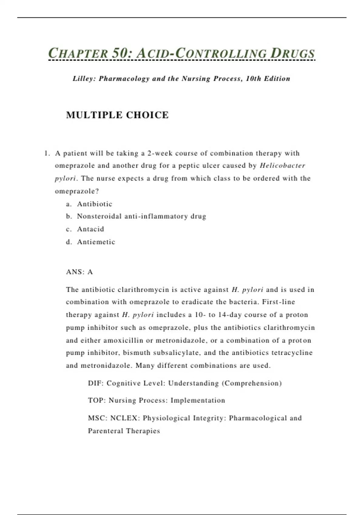 Lilley: Pharmacology and the Nursing Process, 10th Edition MULTIPLE CHOICE 1. A patient will be taking a 2-week course of combination therapy with omeprazole and another drug for a peptic ulcer caused by Helicobacter pylori. The nurse expects a drug from which class to be ordered with the omeprazole? a. Antibiotic b. Nonsteroidal anti-inflammatory drug c. Antacid d. Antiemetic ANS: A The antibiotic clarithromycin is active against H. pylori and is used in combination with omeprazole to eradicate the bacteria. First-line therapy against H. pylori includes a 10- to 14-day course of a proton pump inhibitor such as omeprazole, plus the antibiotics clarithromycin and either amoxicillin or metronidazole, or a combination of a proton pump inhibitor, bismuth subsalicylate, and the antibiotics tetracycline and metronidazole. Many different combinations are used. DIF: Cognitive Level: Understanding (Comprehension) TOP: Nursing Process: Implementation MSC: NCLEX: Physiological Integrity: Pharmacological and Parenteral Therapies 2. A patient is asking advice about which over-the-counter antacid is considered the most safe to use for heartburn. The nurse explains that the reason that calcium antacids are not used as frequently as other antacids is for which of these reasons? a. Their use may result in kidney stones. b. They cause decreased gastric acid production. c. They cause severe diarrhea. d. Their use may result in fluid retention and edema. ANS: A Calcium antacids are not used as frequently as other antacids because their use may lead to the development of kidney stones; they also cause increased gastric acid production. The other options are incorrect. DIF: Cognitive Level: Understanding (Comprehension) TOP: Nursing Process: Planning MSC: NCLEX: Physiological Integrity: Pharmacological and Parenteral Therapies 3. At 0900, the nurse is about to give morning medications, and the patient has asked for a dose of antacid for severe heartburn. Which schedule for the antacid and medications is correct? a. Give both the antacid and medications at 0900. b. Give the antacid at 0900, and then the medications at 0930. c. Give the medications at 0900, and then the antacid at 1000. d. Give the medications at 0900, and then the antacid at 0915.