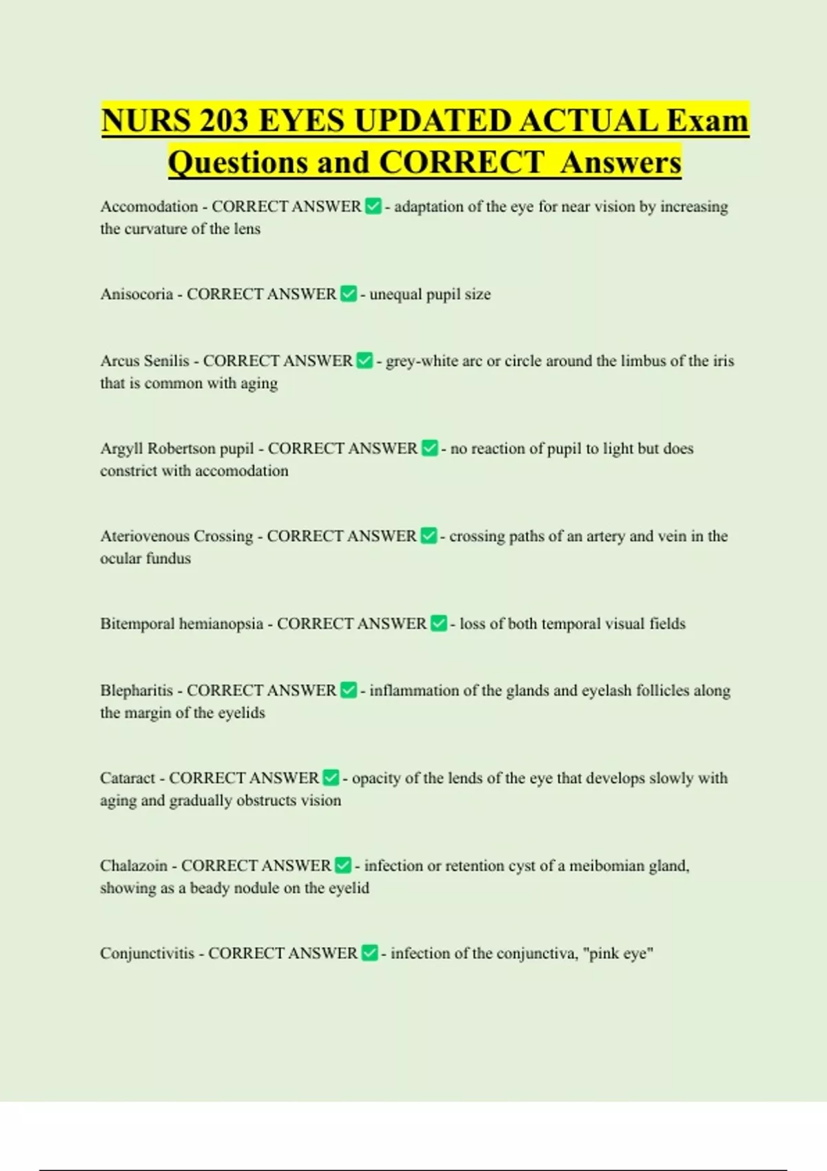 NURS 203 EYES UPDATED ACTUAL Exam Questions and CORRECT Answers